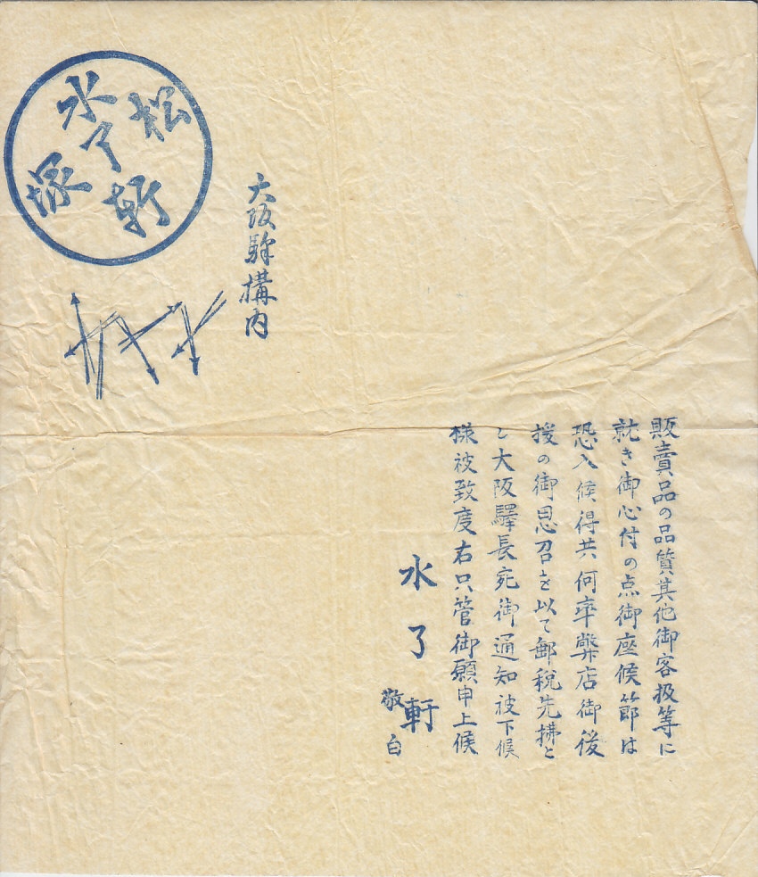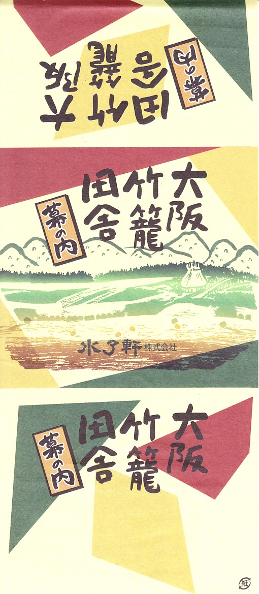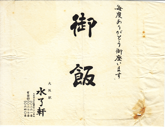 1910年代のものではないかと推測する、昔の大阪駅弁の掛紙。掛紙でなくお手拭き、ナプキンではないかと思う紙質と大きさを持つが、「販売品の品質その他…」という注意書きはそれに不要だろうから、駅弁その他の構内販売品に添付したのかもしれない。水了軒は今もその名が残る大阪の駅弁屋であり、松塚はその創業者である。