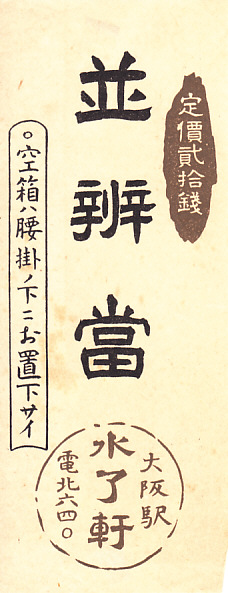 1920年頃、大正10年頃のものと思われる、昔の大阪駅弁の掛紙。当時の幕の内駅弁は上等と普通が規定され、普通のものは一般に「御辨當」を名乗ったので、定価表以外の駅弁掛紙で「並辨當」という表記は初めて見た。掛紙の絵柄も形状も、今に残る当時の駅弁掛紙にない感じ。