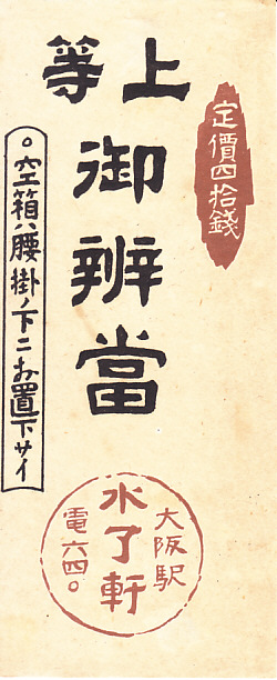 1920年頃、大正10年頃のものと思われる、昔の大阪駅弁の掛紙。40銭という価格から時期を推定し、同じ意匠を持つ上記の「並辨當」にも反映した。そんな掛紙の絵柄も形状も、今に残る当時の駅弁掛紙にない感じ。