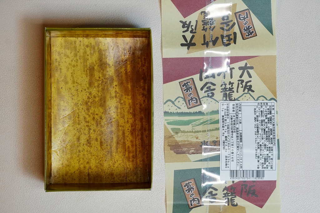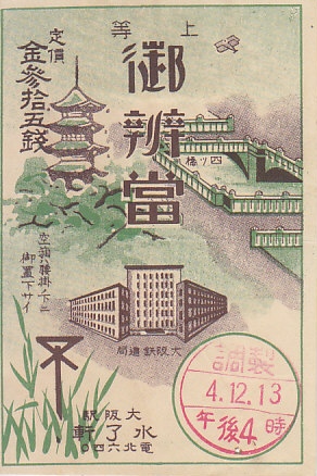1929(昭和4)年12月13日16時の調製と思われる、昔の大阪駅弁の掛紙。同じ年の大阪駅弁「小鯛雀鮨」と同じ絵柄。
