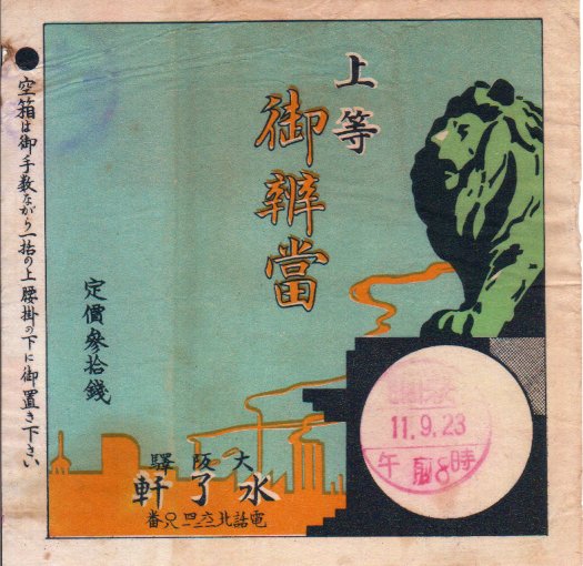 1936(昭和11)年9月23日8時の調製と思われる、昔の大阪駅弁の掛紙。当時の表現でいう大大阪(だいおおさか)の工業地帯や市街と、おそらく難波橋(なにわばし)の獅子像を描く。
