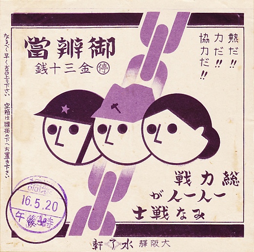 1941(昭和16)年5月20日の調製と思われる、昔の大阪駅弁の掛紙。「熱だ!!力だ!!協力だ!!」「総力戦一人一人がみな戦士」、そして兵士と工員と主婦に見える顔を並べて、聖戦の遂行を鼓舞する。しかしその絵柄がかわいらしすぎて、戦中の掛紙に見えない感じ。