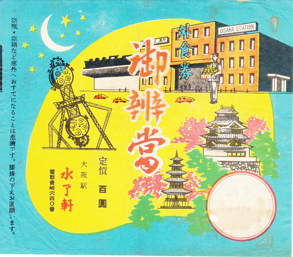 1954(昭和27)年10月27日の調製と思われる、昔の大阪駅弁の掛紙。大阪駅舎と大阪城と四天王寺五重塔、そして大阪市立電気科学館6階「天象館」のプラネタリウムを描いたと思われる。外食券とは、1942(昭和17)年2月制定の食糧管理法に基づき、主食を外食する者のために発行された券。食糧難の時代はこれがないと、食堂や旅館や弁当で米飯を食べられなかった。制度としては1969(昭和44)年まで残ったが、昭和20年代が終わる頃には形骸化したという。