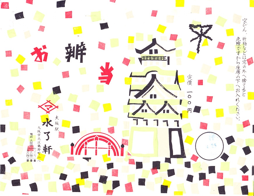 1960(昭和35)年4月25日の調製と思われる、昔の大阪駅弁の掛紙。絵柄は地域の風景に見えなくもないが、具体的には分からない。大阪城、どこかの太鼓橋、大阪市章、紙吹雪か何かの、賑やかな絵柄。