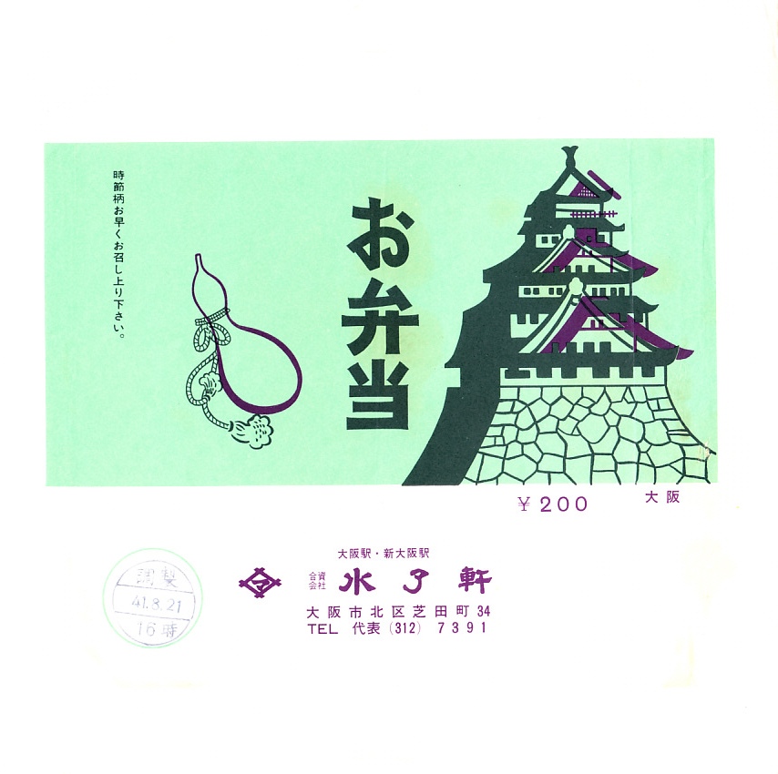 1966(昭和41)年8月21日16時の調製と思われる、昔の大阪駅弁の掛紙。大阪城天守とひょうたんで、シンプルな絵柄。