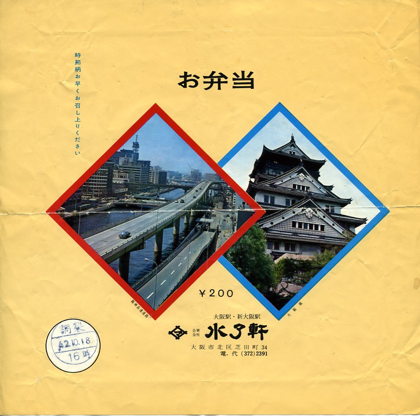 1967(昭和42)年10月18日16時の調製と思われる、昔の大阪駅弁の掛紙。右側の大阪城の写真は60年前を思わせないが、左側の阪神高速道路の写真はまさに60年前。1970(昭和45)年の万国博に向けて、当時の大阪では都市基盤整備が急ピッチで進められていた。
