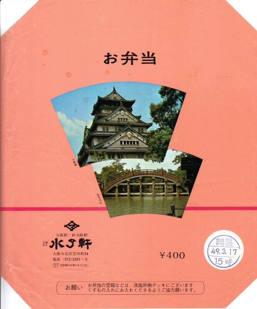 1974(昭和49)年3月17日の調製と思われる、昔の大阪駅弁の掛紙。第一次オイルショックの頃の駅弁掛紙。戦後最大の不況の時代、大阪城と住吉大社の写真はきれいだが、寂しくシンプルなデザインとも思える。