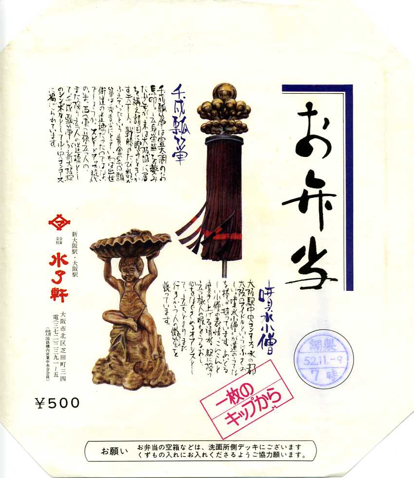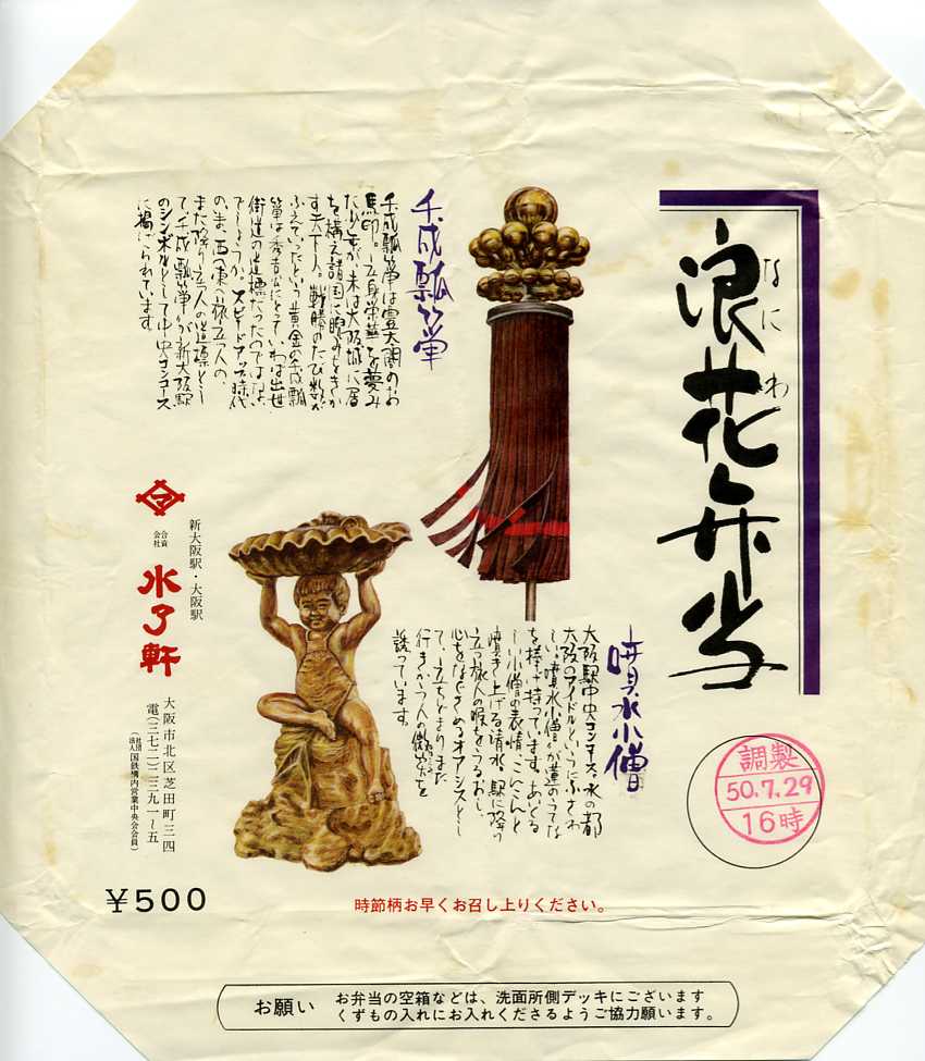 1975(昭和50)年7月29日16時の調製と思われる、昔の大阪駅弁の掛紙。名前からして大阪らしい。掛紙に写真を載せた千成瓢箪と噴水小僧は、それぞれ新大阪駅と大阪駅のシンボルとして展示されたものだそうな。