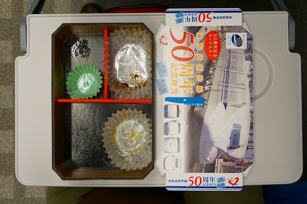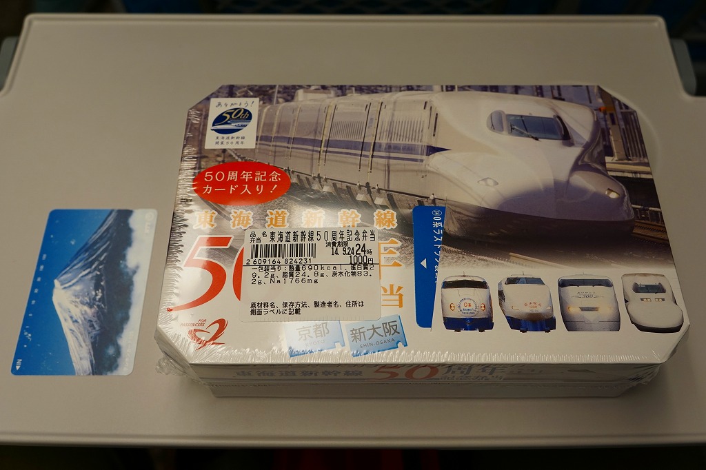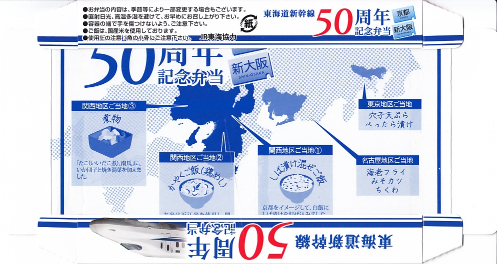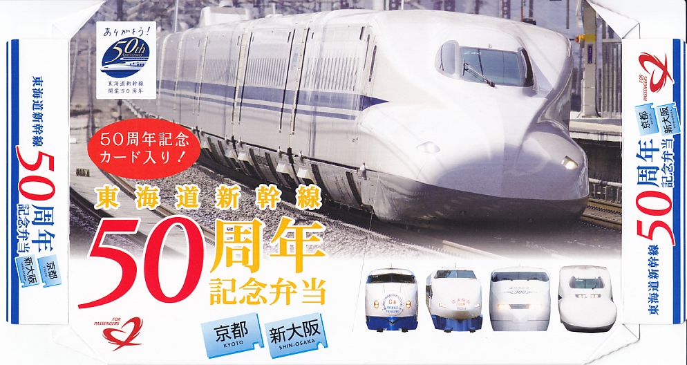 東海道新幹線の開業50周年を記念して、「東京・品川・新横浜」「名古屋」「京都・新大阪」の3種類を、2014(平成26)年4月1日から12月まで販売した記念駅弁。販売期間の前半と後半で異なる絵柄のふたを使い、この写真は後半版。さらに全50種類の中から1枚の記念カードを添付するといい、東海道新幹線の駅弁では珍しく、コレクター仕様を取り入れた。