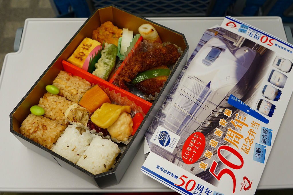 この「京都・新大阪」バージョンの中身は、 鶏飯としば漬け混ぜ御飯の俵飯、焼き湯葉、 エビフライ、みそかつ、イイダコ煮、イカ団子、アナゴ天、サワラ西京焼、50th焼き印の玉子焼など。そんな内容の割には、見た目も味も整然としている。後に3バージョンを統合した「東海道新幹線弁当」として、2015(平成27)年4月2日にレギュラー商品化した。