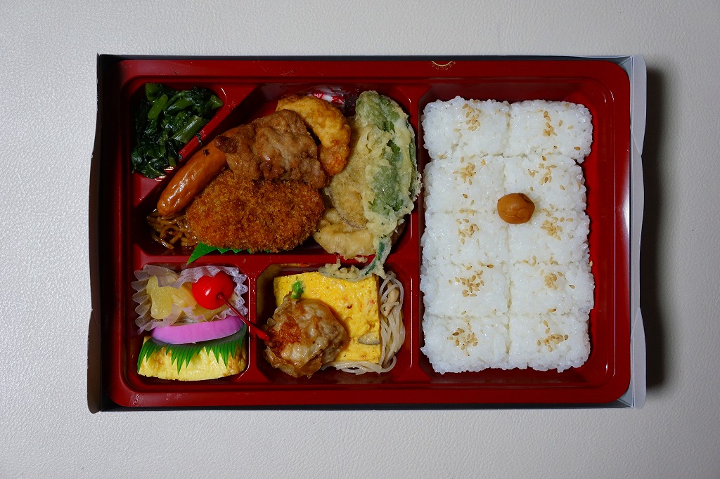 底を除き経木を使う長方形容器を使用、中身は胡麻振り俵型御飯に鮭の焼魚・蒲鉾・玉子焼が入る一般的な幕の内弁当も、容器内に隙間が目立つ代わりによく調理されて冷めてもおいしい多種多様な煮物揚物が乱雑に配置され、見栄えは悪いが味と量は悪くない駅弁。