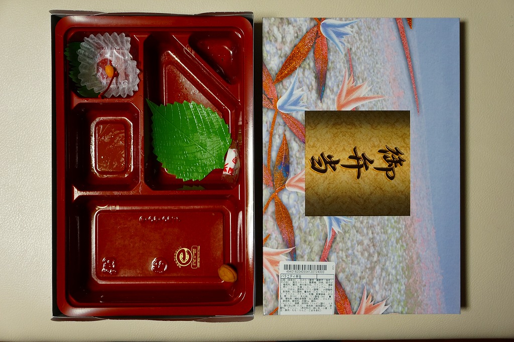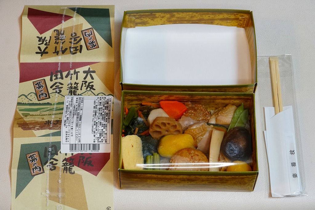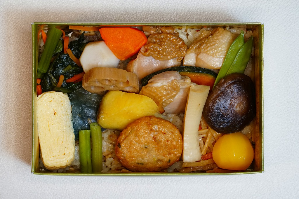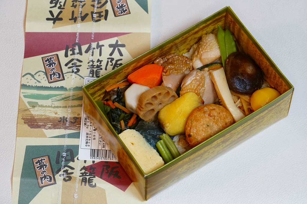 2021(令和3)年の年末までに発売か。掛紙で竹籠と言い張る、竹皮の絵柄を印刷したボール紙の容器に、五目御飯をじかに詰め、鶏照焼、れんこんとサトイモとにんじんと椎茸の煮物、玉子焼、鶏つくね、小松菜、くり、ひじきなどを散らして覆う。やはり掛紙では幕の内と言い張るが、これは鶏飯だろう。なかなか値の張る、きれいでおいしいお弁当。価格は2022年の購入時で1,290円、2023年時点で1,350円、2024年時点で1,380円、2025年時点で1,390円。
