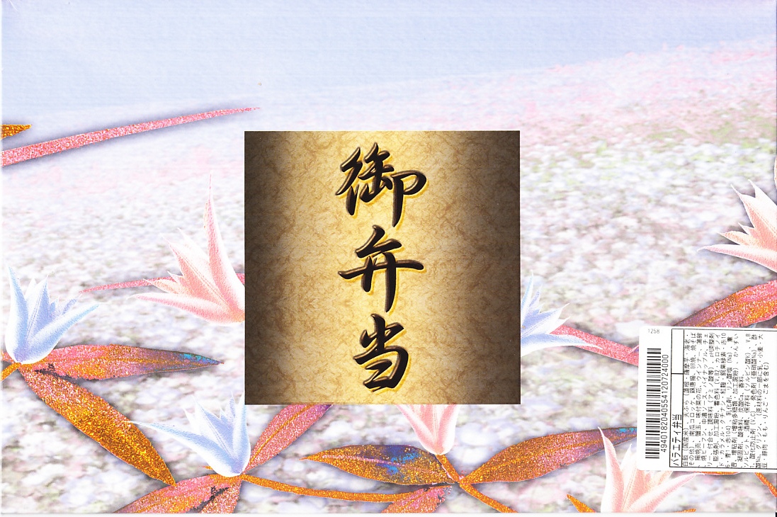 1973(昭和48)年10月26日16時の調製と思われる、昔の大阪駅弁の掛紙。どぎつい色彩の花と鳥でできた絵柄。こういう名前の駅弁は、おそらく幕の内弁当だと思う。