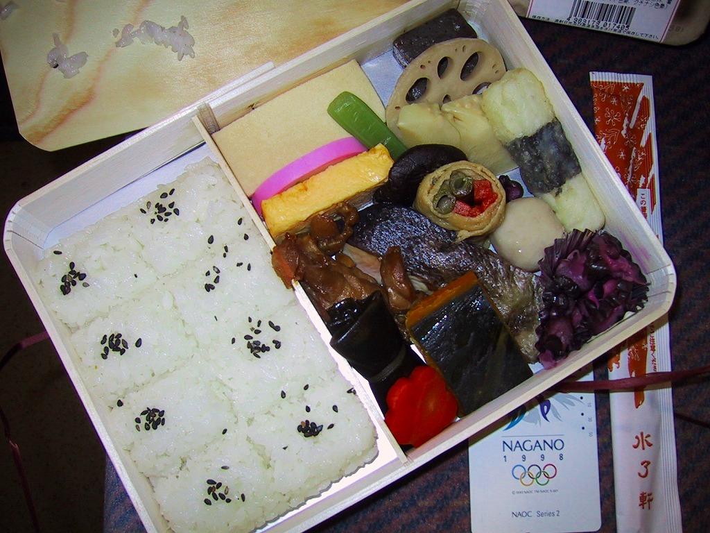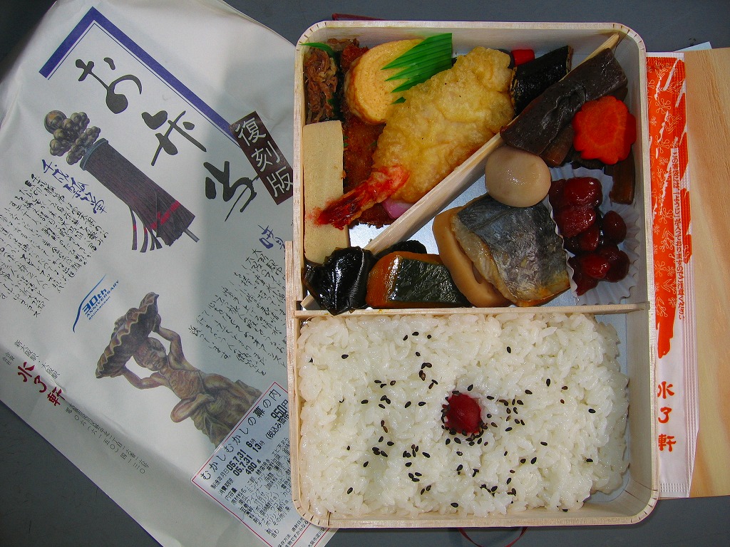 東海道新幹線700系のぞみ号キャンペーンの一環で、2000(平成12)年に発売。駅弁の原点を目指したそうで、日の丸俵飯に焼き魚、かまぼこ、玉子焼で幕の内駅弁三種の神器を詰め、煮物や漬物を添える。原点の経木折が華奢な紙との合成品になり、掛紙が紙ふたになったのは仕方がなくても、三種の神器の見栄えも大きさも味もいまいちで、これよりも普段の水了軒の幕の内弁当のほうが見た目も内容も風味もうまくできている。なお、駅弁の名前はラベルでは「汽車弁当」、紙のふたは「シ氣」の文字を使う。
