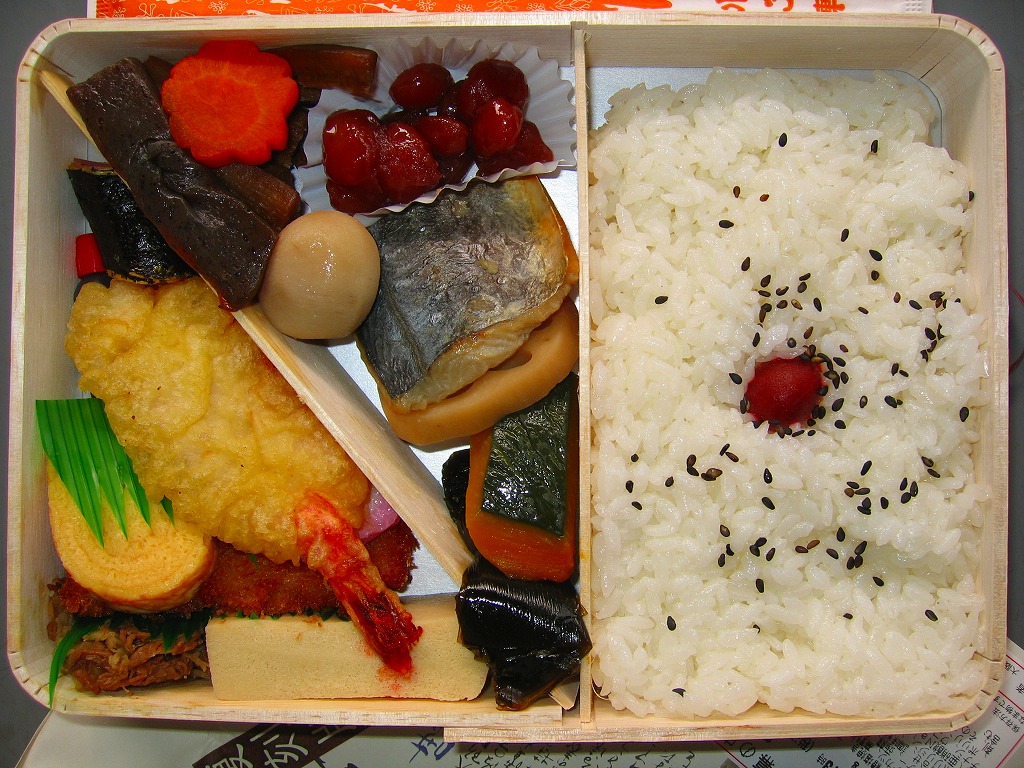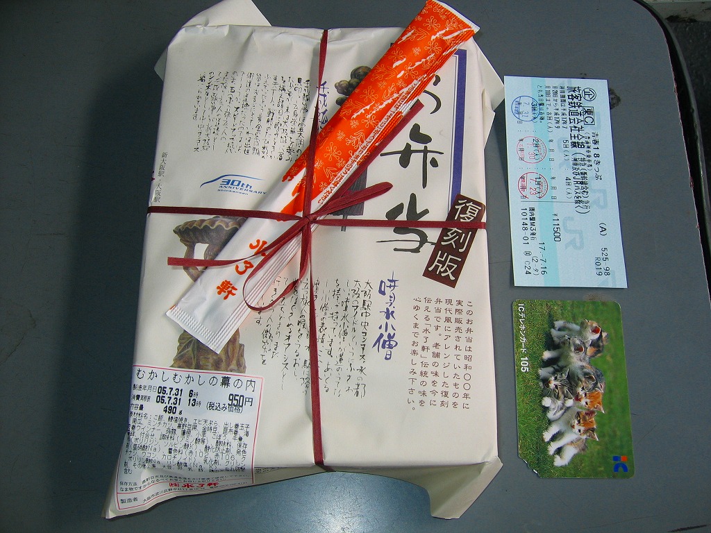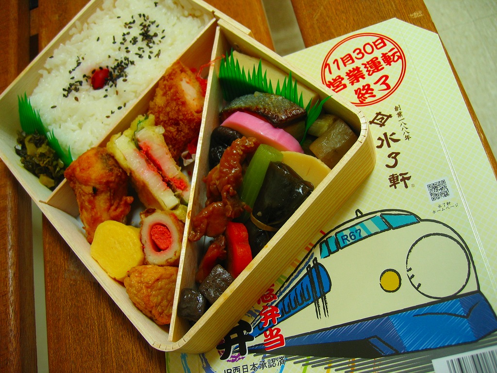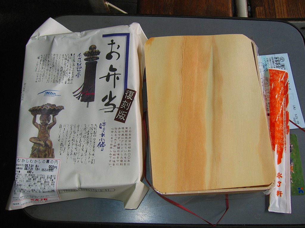 阪神百貨店の地下食料品売り場で購入。潰れた駅弁屋の商標を買い取った業者が発売。その姿は、下記のかつての大阪駅弁「汽車辨」に、とてもよく似ている。おそらく似せたのではないかと思う。駅弁サイズの経木折風容器に、俵飯と柴漬けを詰め、焼鮭、かまぼこ、玉子焼、鶏肉、煮物、ミニ大福などを添える。幕の内駅弁の味、大阪駅の駅弁の味が、ここに再現されていた。しかし、駅で売られることはない模様。