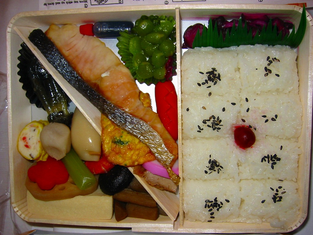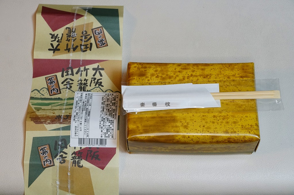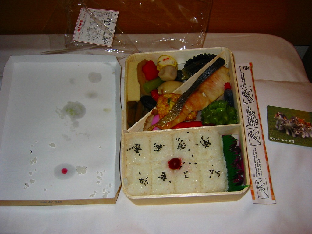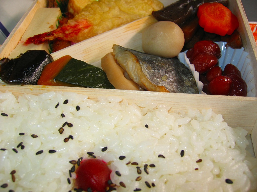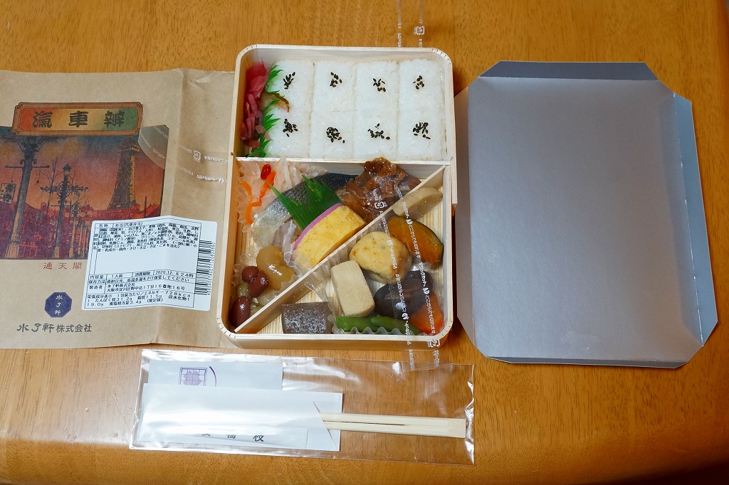 阪神百貨店の地下食料品売り場で購入。潰れた駅弁屋の商標を買い取った業者が発売。その姿は、下記のかつての大阪駅弁「汽車辨」に、とてもよく似ている。おそらく似せたのではないかと思う。駅弁サイズの経木折風容器に、俵飯と柴漬けを詰め、焼鮭、かまぼこ、玉子焼、鶏肉、煮物、ミニ大福などを添える。幕の内駅弁の味、大阪駅の駅弁の味が、ここに再現されていた。しかし、駅で売られることはない模様。