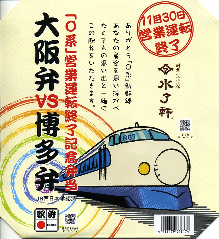 今回のパッケージのテーマは、2008年11月30日限りでの0系新幹線電車営業運転終了。これをテーマにした駅弁は沿線各地に出ているが、いずれもなぜか不思議と新幹線のイラストに編成番号「R67」を明記している。そんな業務用の表示はJR社員と鉄道ファンしか気にならない。0系新幹線電車は国鉄時代に登場しているため、JR西日本が0系新幹線の駅弁を承認する際に、JR西日本のオリジナルな点を入れる必要があったのだろうか。