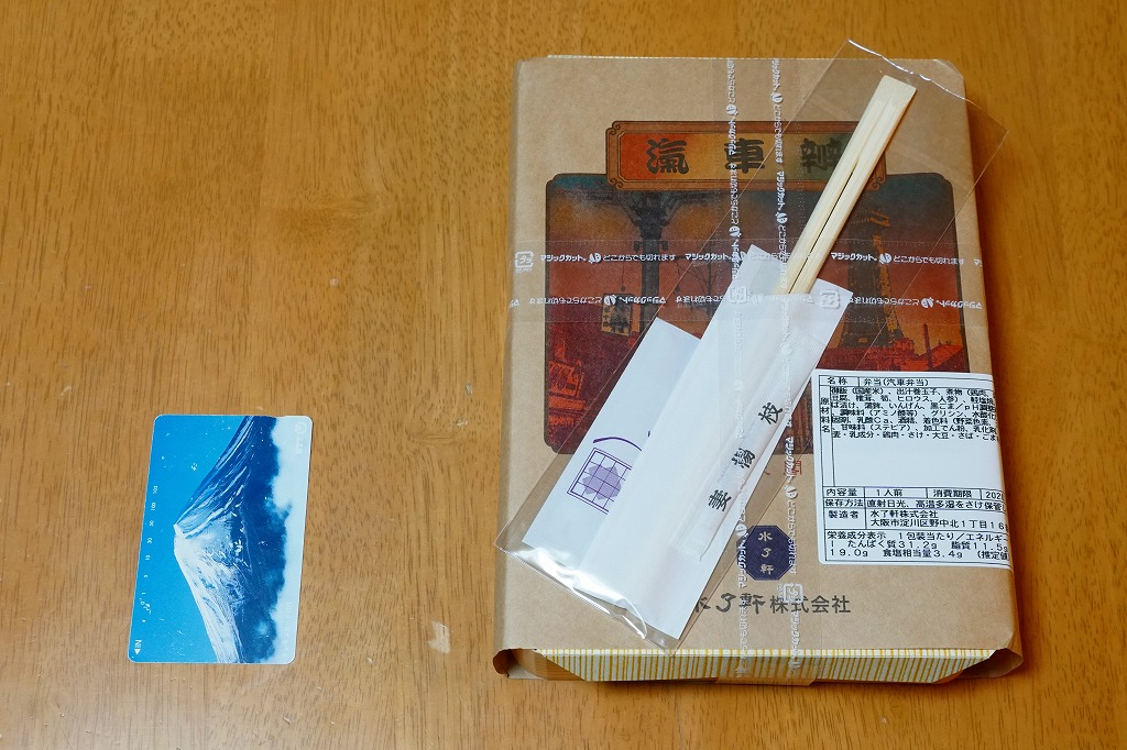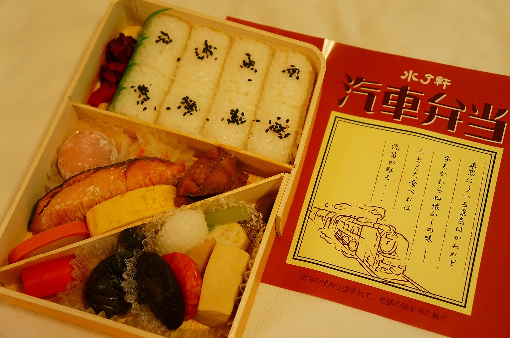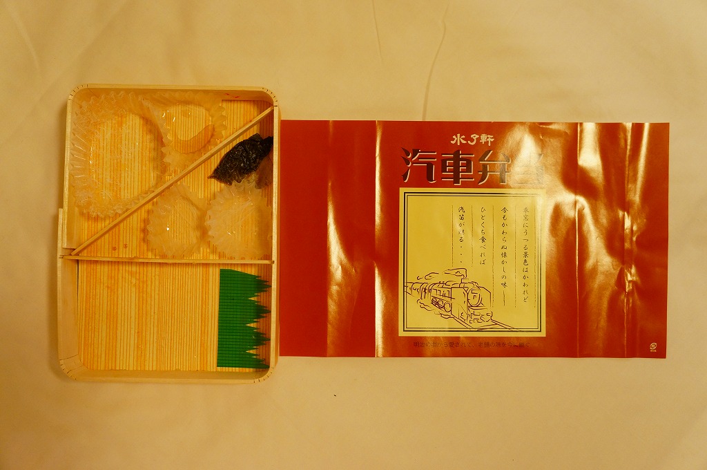 2019(令和元)年にこの姿になったものか。案内や宣伝は見当たらないが、これは2000(平成12)年に当時の水了軒が発売した駅弁を、新たな水了軒が「汽車弁当」の名で復刻し、さらに名前や掛紙の絵柄まで復刻したもの。