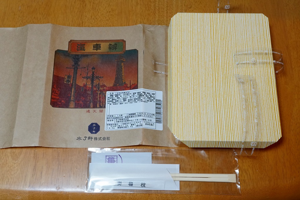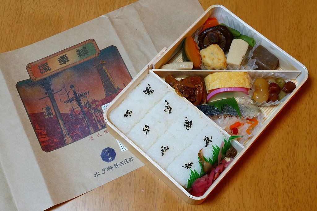掛紙には昭和時代初期の通天閣と新世界の写真が、加工されて使われる。中身は俵飯に漬物を添え、がんもやシイタケやカボチャや野豆腐などの煮物と、鮭と玉子と鶏の焼き物などのおかずを、ゴロゴロと転がすもの。見栄えも内容も、昭和時代を感じさせる幕の内駅弁。価格は2020年時点では、2000年当時と同じ980円、2022年時点で1,050円、2023年時点で1,230円、2025年時点で1,280円。