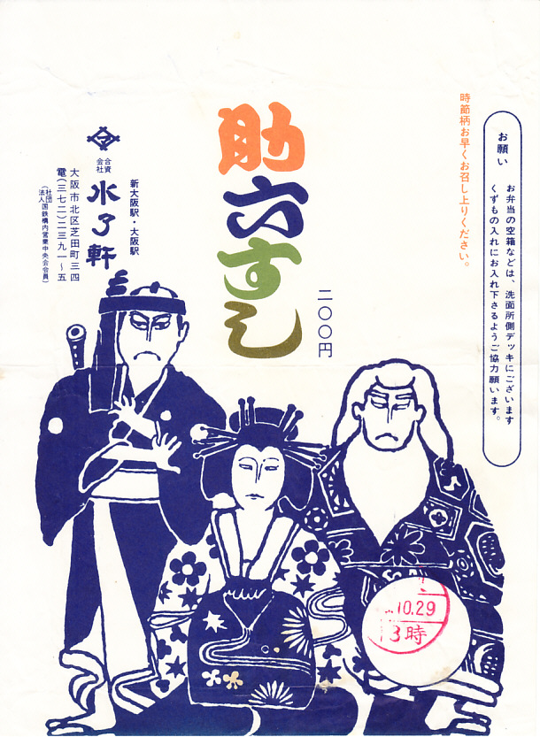 昭和40年代、1970年前後の、10月29日13時の調製と思われる、昔の大阪駅弁の掛紙。助六寿司の名前の由来となった、歌舞伎の助六由縁江戸桜に登場する、左から花川戸助六こと曽我五郎、三浦屋揚巻、髭の意休を描いたものか。