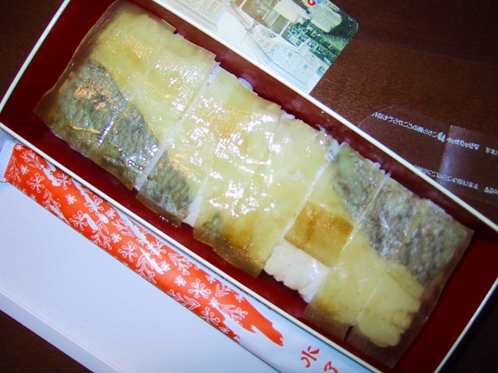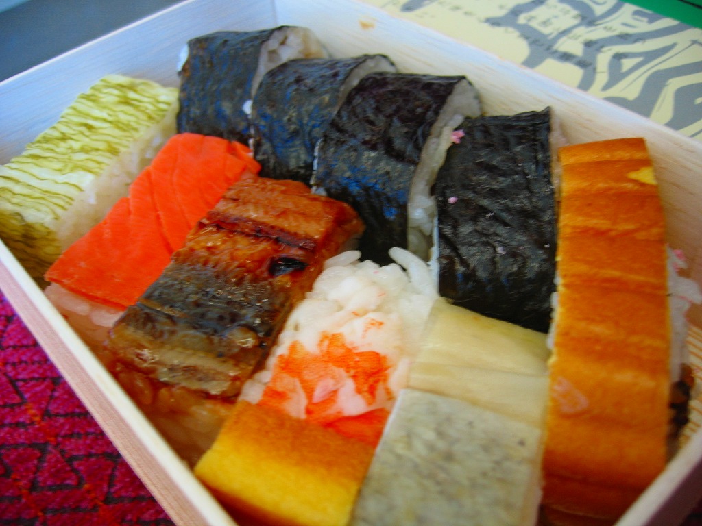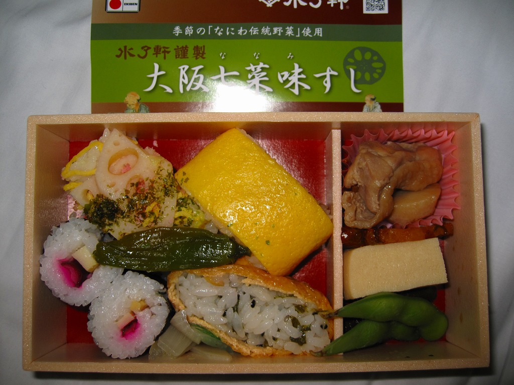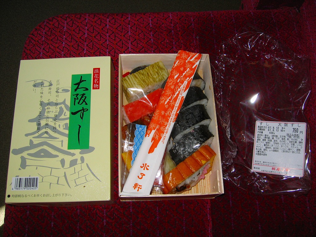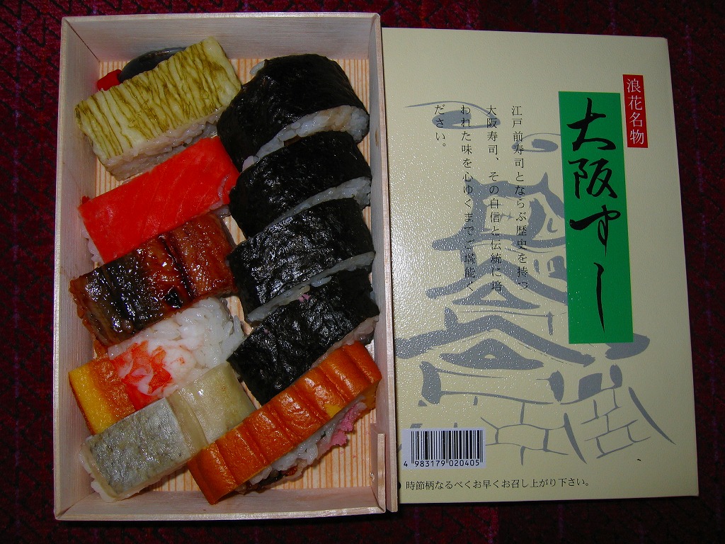大阪駅で伝統の駅弁。経木枠の箱の中に太巻き4切れと伊達巻1切れ、それにアナゴ、エビ、タイ、鮭、昆布の箱寿司がそれぞれ1切れずつ入る。関西の伝統的な食文化の一端を詰めて、地味に地道に郷土の味を伝える、駅弁の鑑。この内容で売られ続けることを願いたい。単に食事としても機能的だし、常温で普通にうまい。