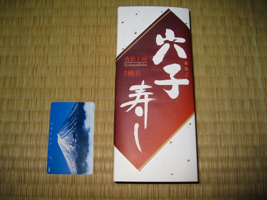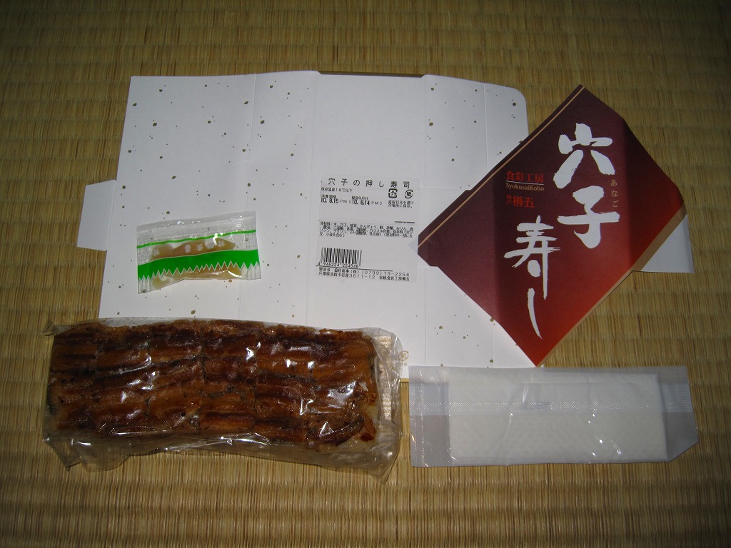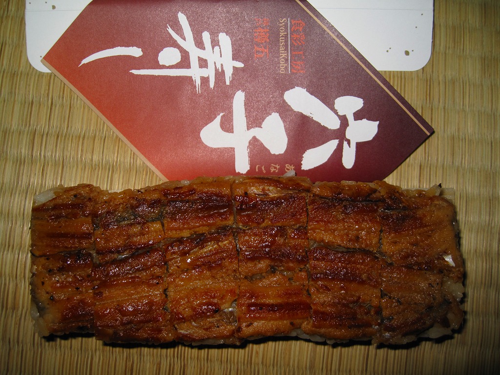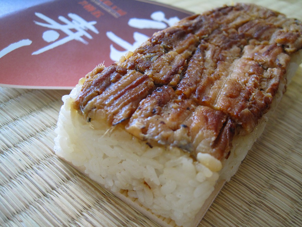 これは駅弁でなく、明石海峡大橋の淡路島側に位置する淡路サービスエリアで販売されていた土産物。小骨が浮き出るワイルドで薄く身の締まった焼きアナゴの棒寿司が1本、ビニール袋に密封されて市販の白い紙箱に収まり、商品名とブランド名を書いた掛紙が巻かれる。少量の割に高価であるが、味付けと食感が硬すぎず柔らか過ぎず、同じ調製元の焼サバ寿司とは雲泥の差。アナゴがいてサバはいない瀬戸内海沿岸では、買う前から選択の方向が見えていたかもしれない。