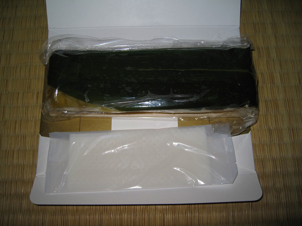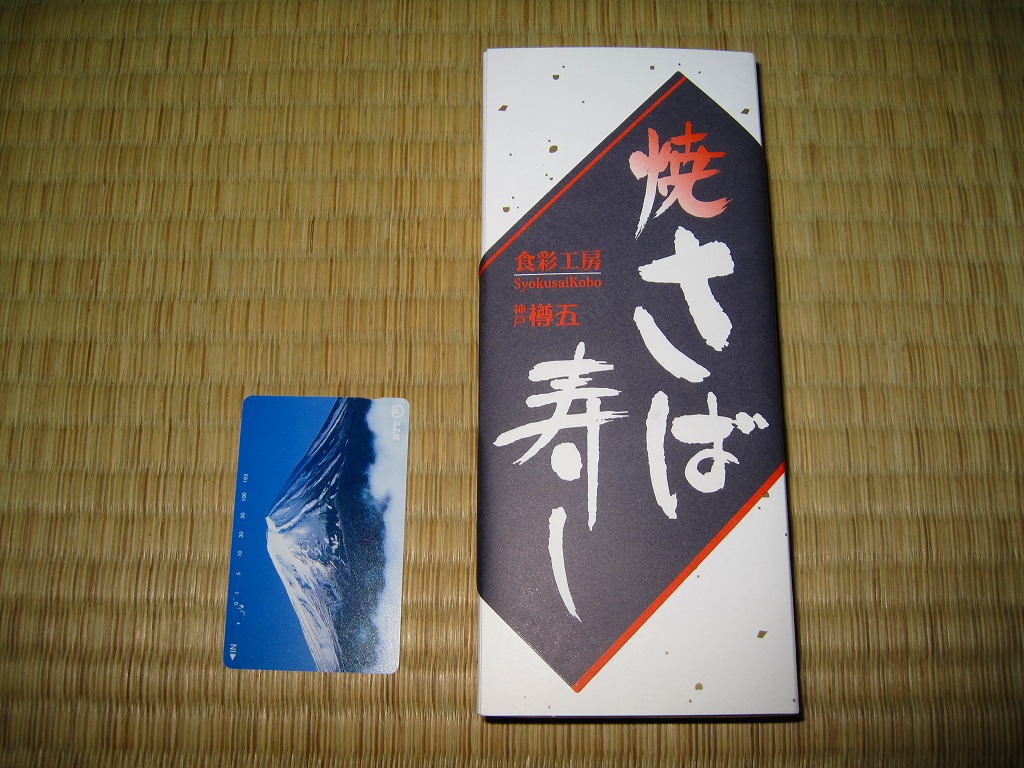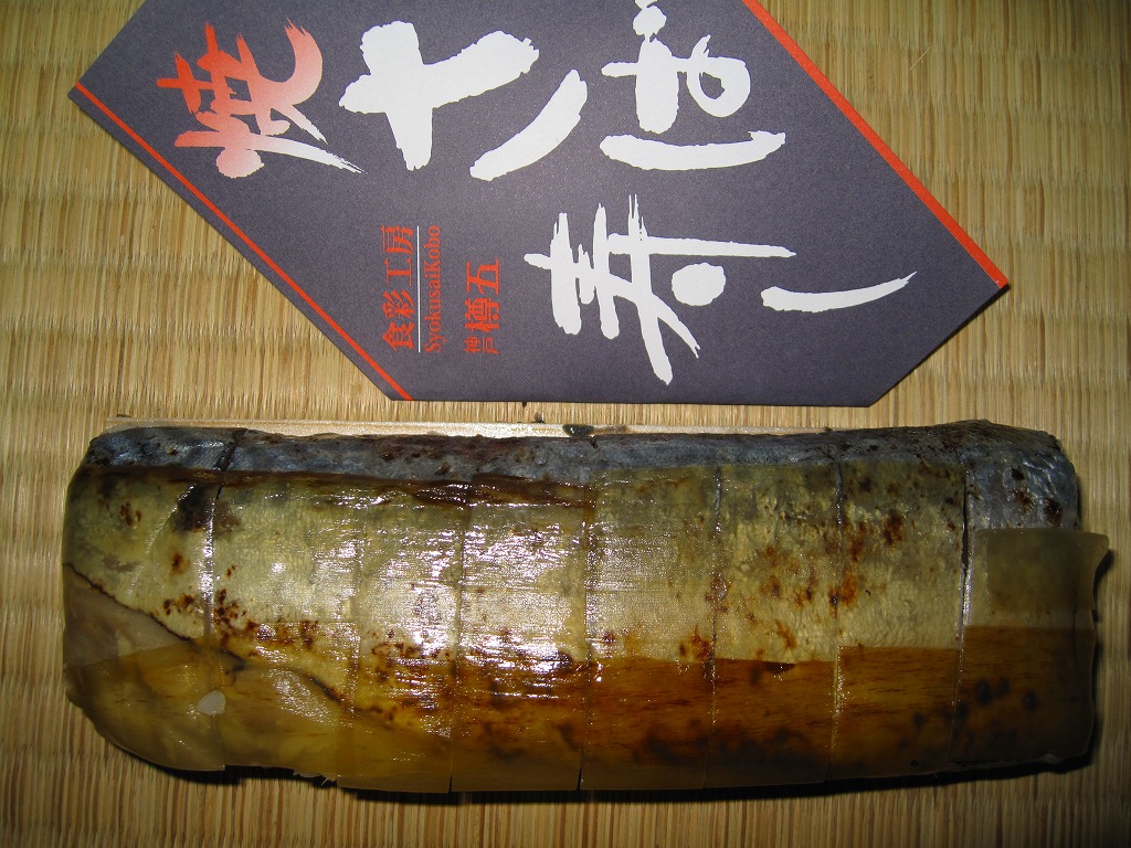 これは駅弁でなく、明石海峡大橋の淡路島側に位置する淡路サービスエリアで販売されていた土産物。板昆布と笹の葉を貼り大葉と生姜を混ぜた焼サバ寿司が1本、ビニール袋に密封されて市販の白い紙箱に収まり、商品名とブランド名を書いた掛紙が巻かれる。食品表示によると高速道路の商品としては珍しく地元で製造されているようであるが、油漬けでべたべたした残念な印象。調製元は江戸時代創業の海産物卸問屋。