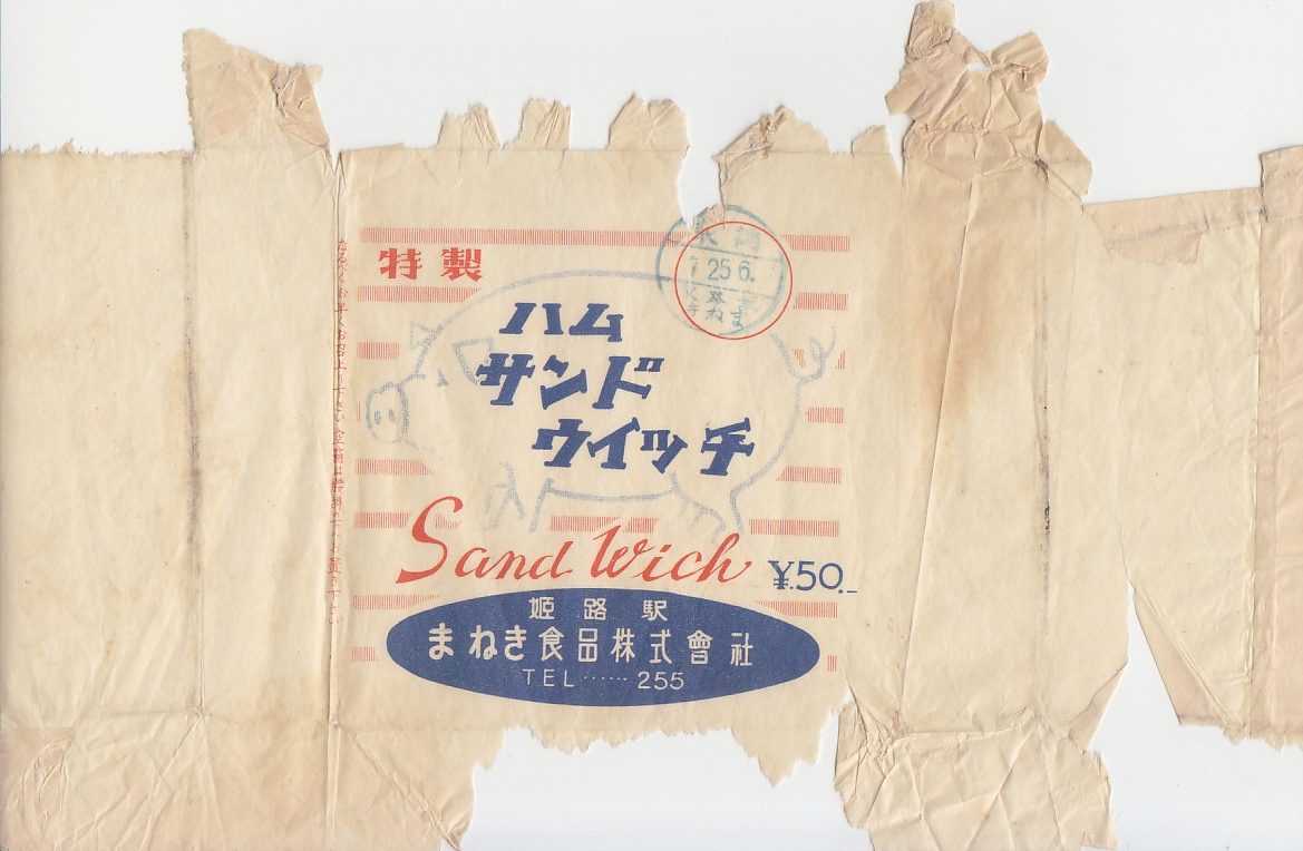1950年代の調製と思われる、昔の姫路駅弁の掛紙。紙質を含め状態が悪いが、おそらく経木の小箱を糊付けで包装したもので、購入者が苦労してはがしたものだと思う。丸々と太ったブタの絵柄。
