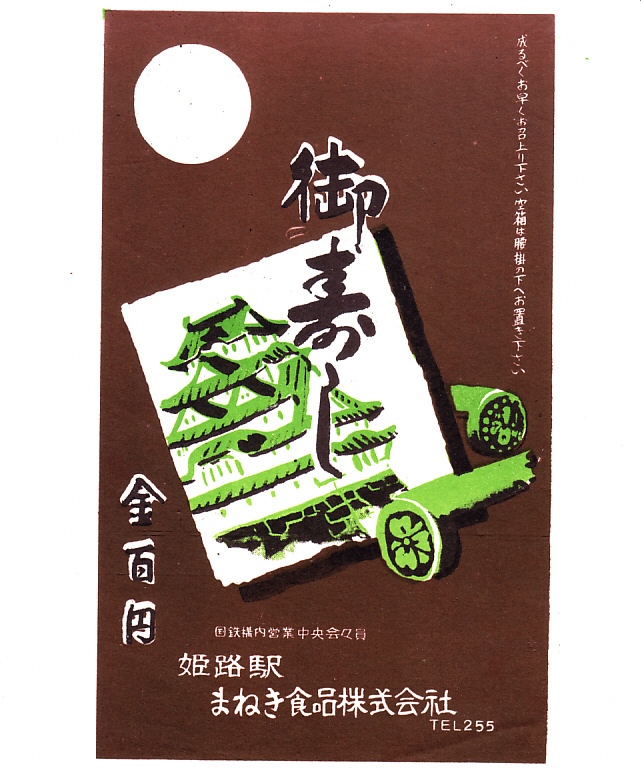 1950年代のものと思われる、昔の姫路駅弁の掛紙。上記の掛紙「御壽し」と同じものでも、白抜きや文字の形が異なるほか、こちらには国鉄構内営業中央会々員の文字がある。