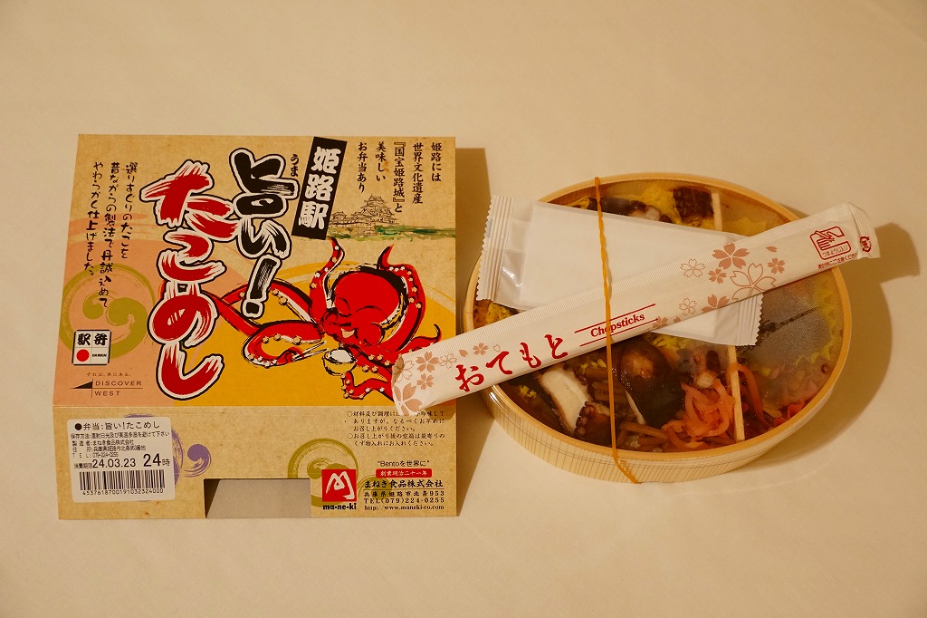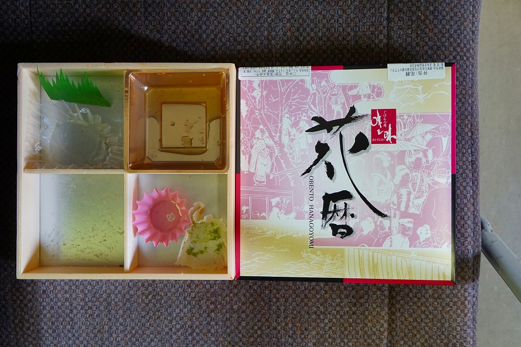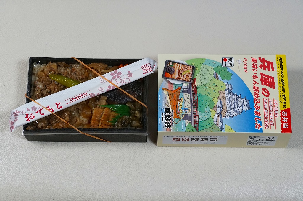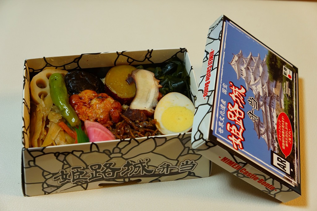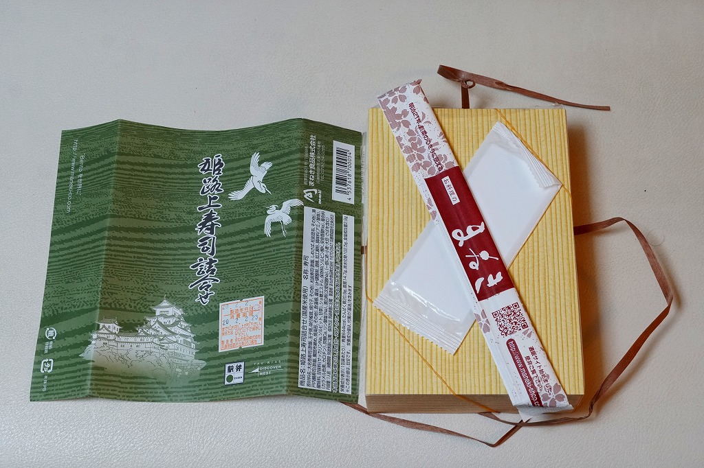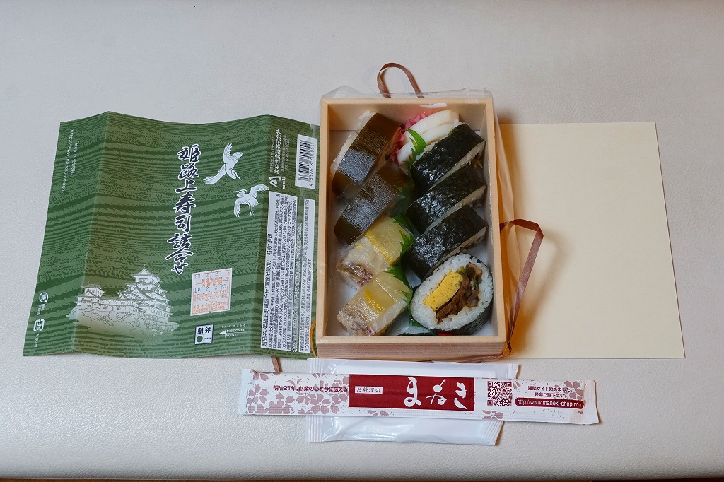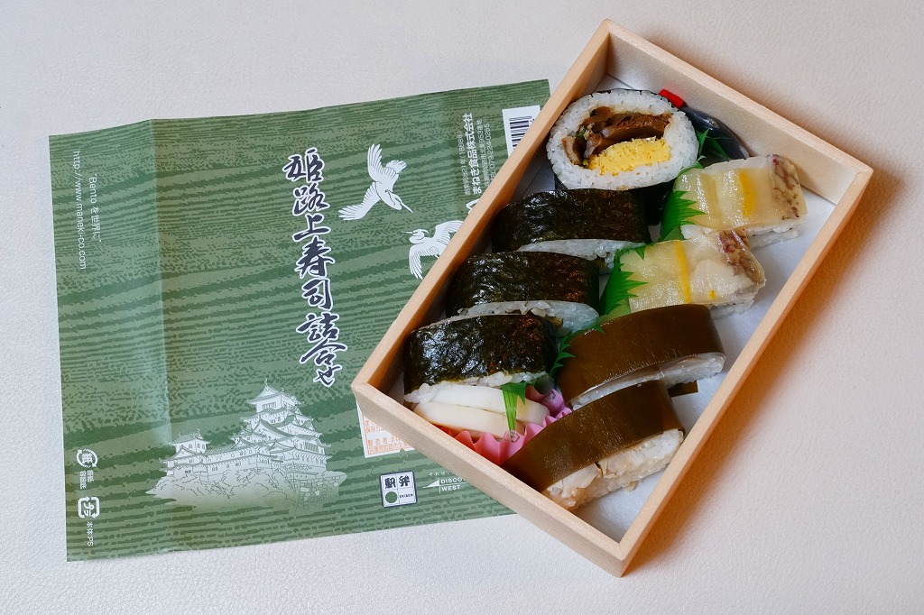 「駅弁図鑑西日本版」によると2016(平成28)年9月の新発売というが、もっと前から売られるものであり、内容からこれは昭和時代からの駅弁だろう。小さな折箱に、大名巻寿司というシイタケや玉子焼などの太巻きを4個、松前寿司という昆布巻のサバ寿司2個、瀬戸内鯛寿司というタイの押寿司2個と、酢れんこん2個を詰める。コウノトリと姫路城を描く掛紙の絵柄を含め、ずいぶんと古めかしい、汽車の時代を思わせるつくり。新幹線の駅と時代での健在に驚いた。2022年時点で駅弁図鑑や調製元の公式サイトから消えている。