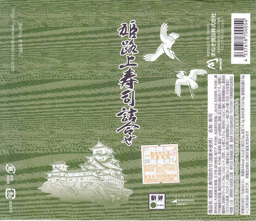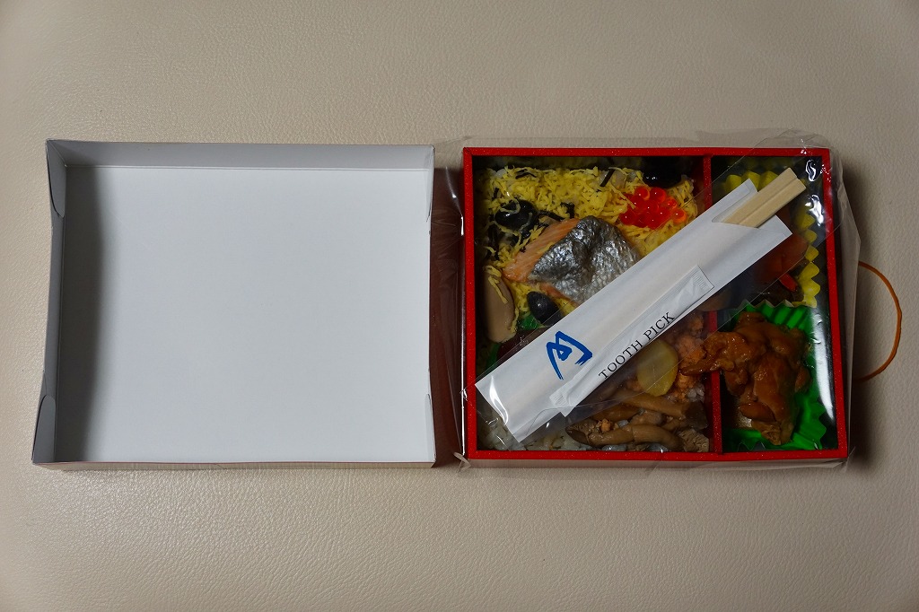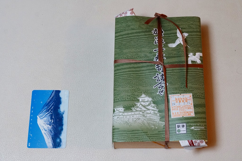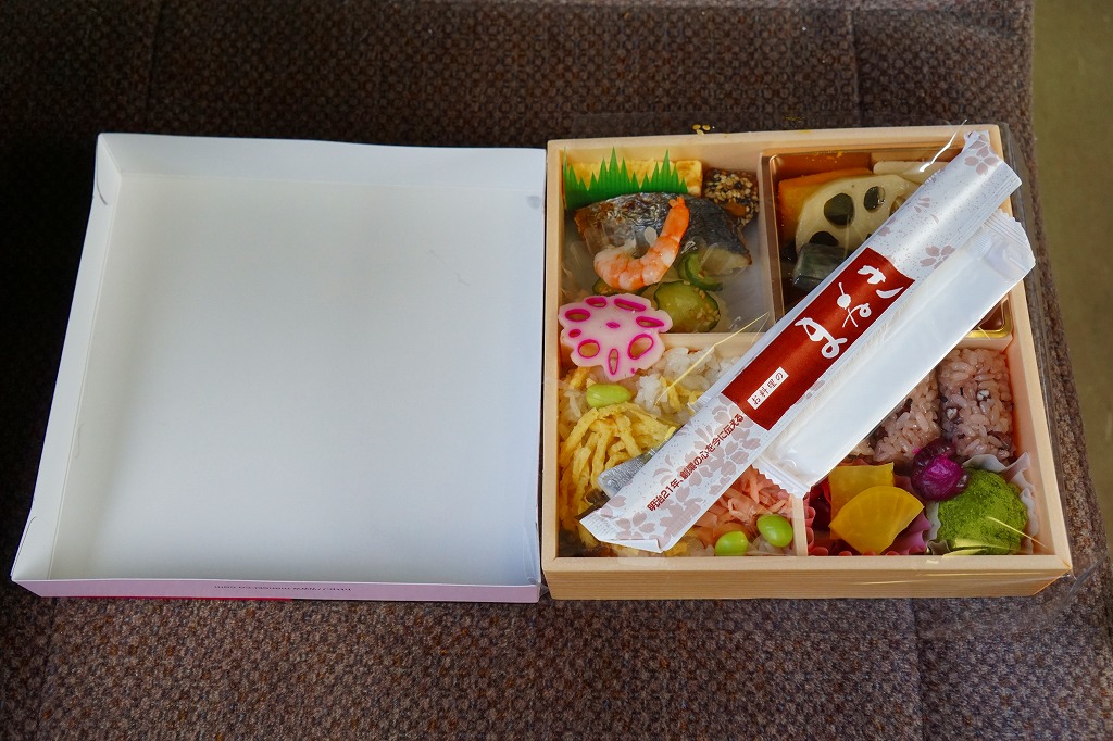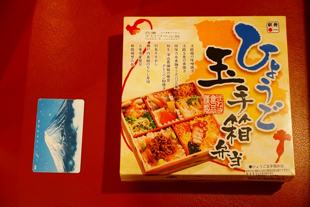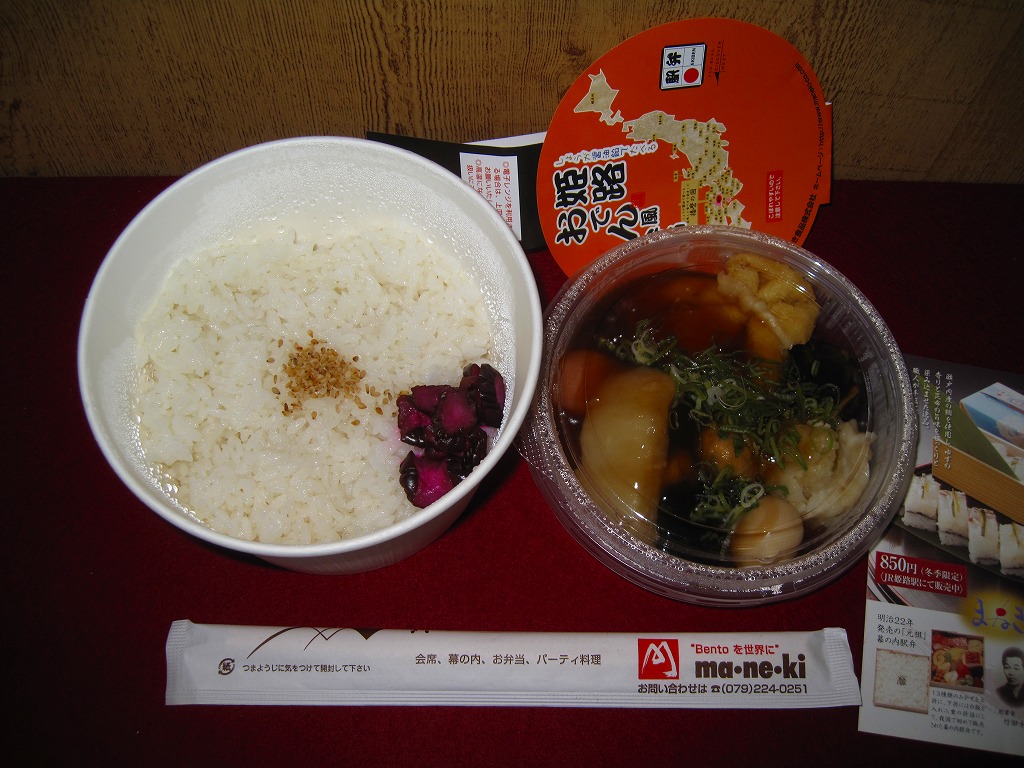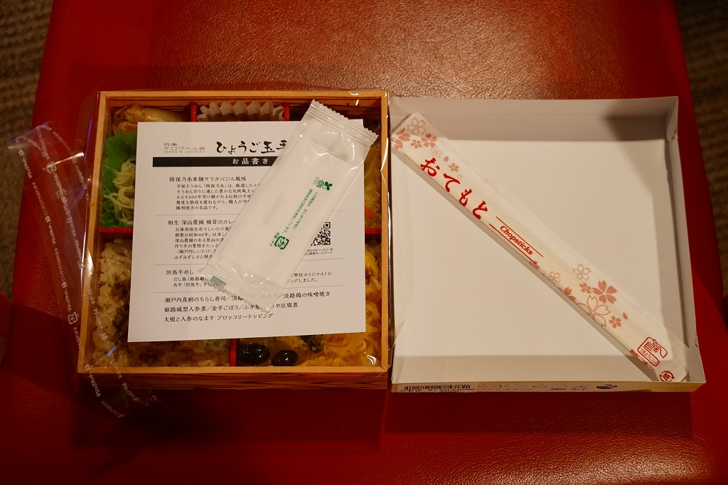 「駅弁図鑑西日本版」によると2016(平成28)年9月の新発売というが、もっと前から売られるものであり、内容からこれは昭和時代からの駅弁だろう。小さな折箱に、大名巻寿司というシイタケや玉子焼などの太巻きを4個、松前寿司という昆布巻のサバ寿司2個、瀬戸内鯛寿司というタイの押寿司2個と、酢れんこん2個を詰める。コウノトリと姫路城を描く掛紙の絵柄を含め、ずいぶんと古めかしい、汽車の時代を思わせるつくり。新幹線の駅と時代での健在に驚いた。2022年時点で駅弁図鑑や調製元の公式サイトから消えている。