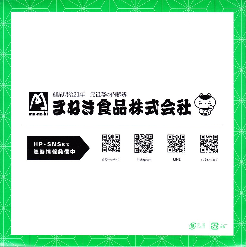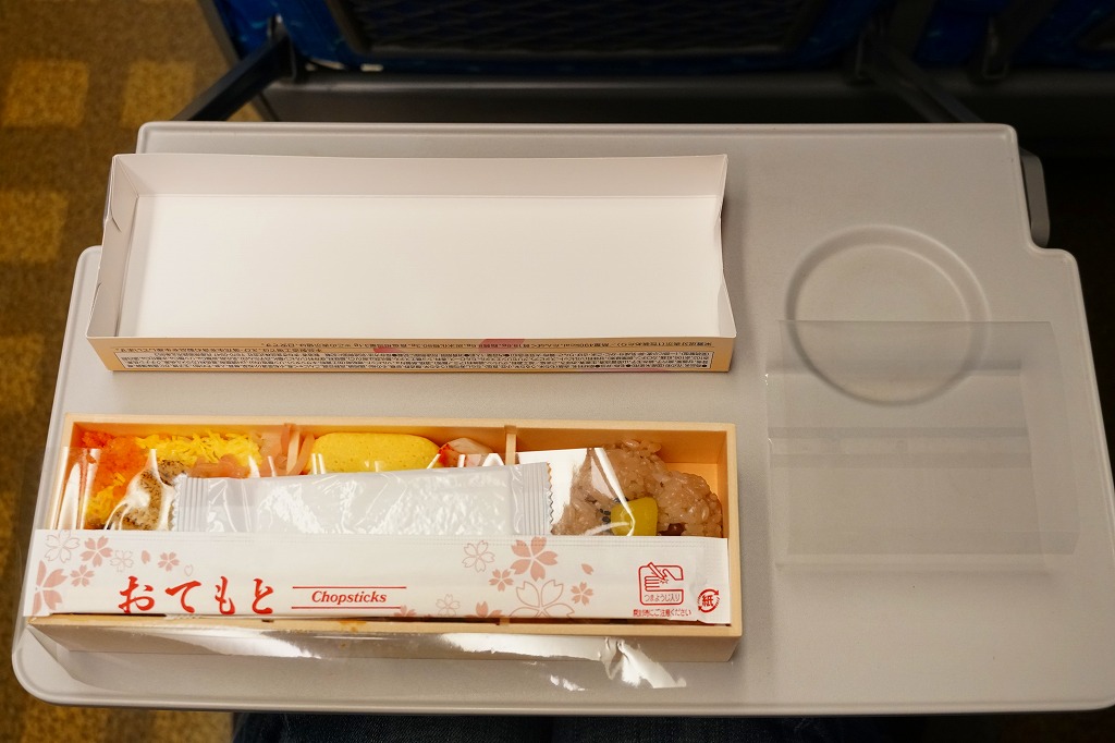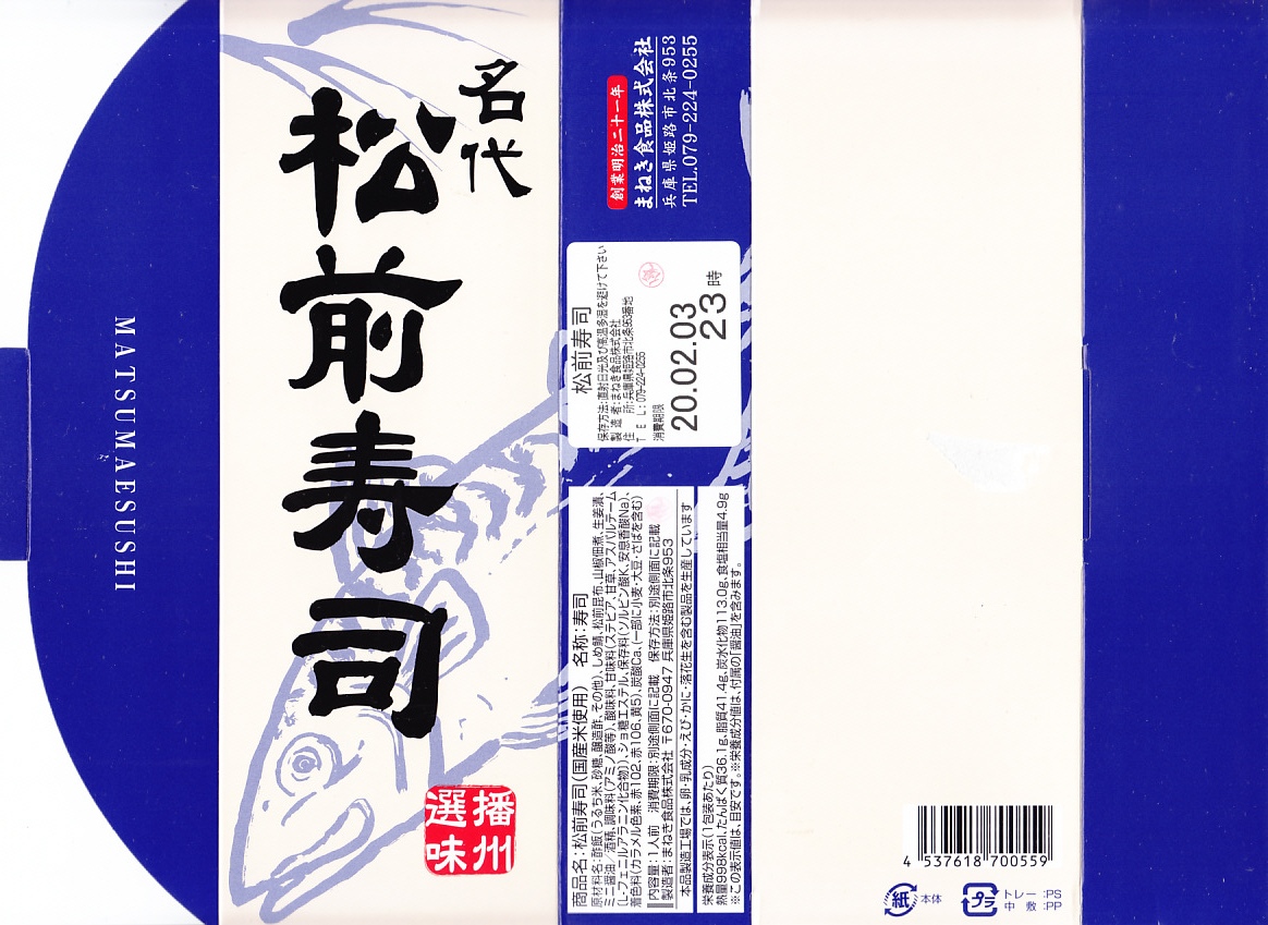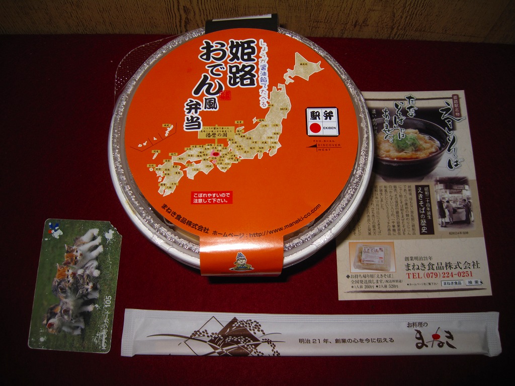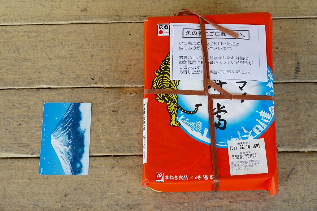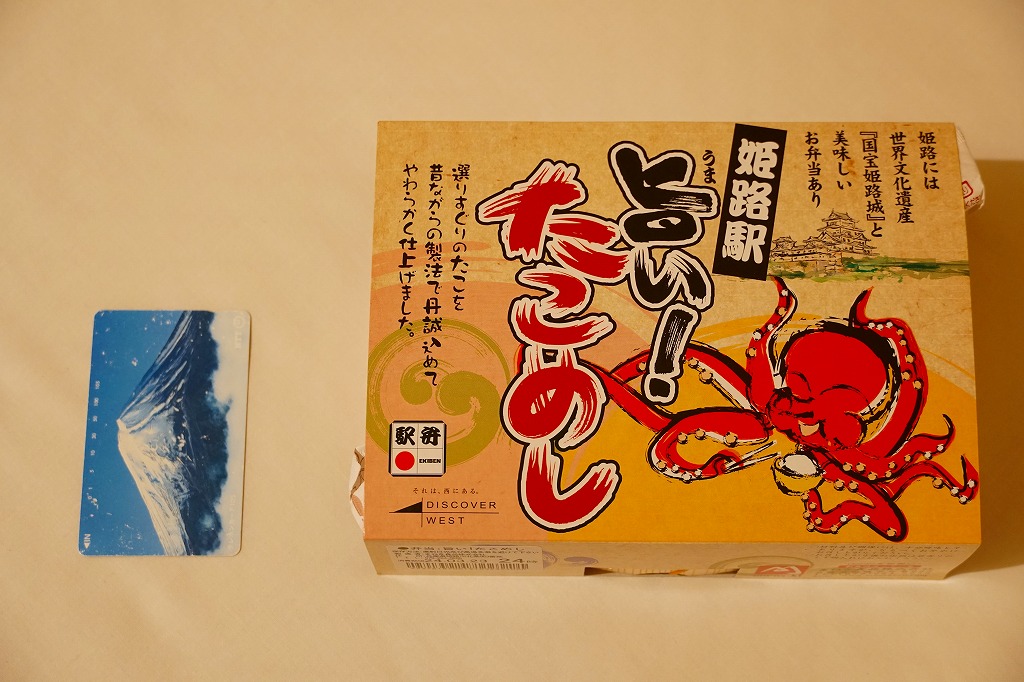 「駅弁図鑑西日本版」によると2016(平成28)年9月の新発売というが、もっと前から売られるものであり、内容からこれは昭和時代からの駅弁だろう。小さな折箱に、大名巻寿司というシイタケや玉子焼などの太巻きを4個、松前寿司という昆布巻のサバ寿司2個、瀬戸内鯛寿司というタイの押寿司2個と、酢れんこん2個を詰める。コウノトリと姫路城を描く掛紙の絵柄を含め、ずいぶんと古めかしい、汽車の時代を思わせるつくり。新幹線の駅と時代での健在に驚いた。2022年時点で駅弁図鑑や調製元の公式サイトから消えている。