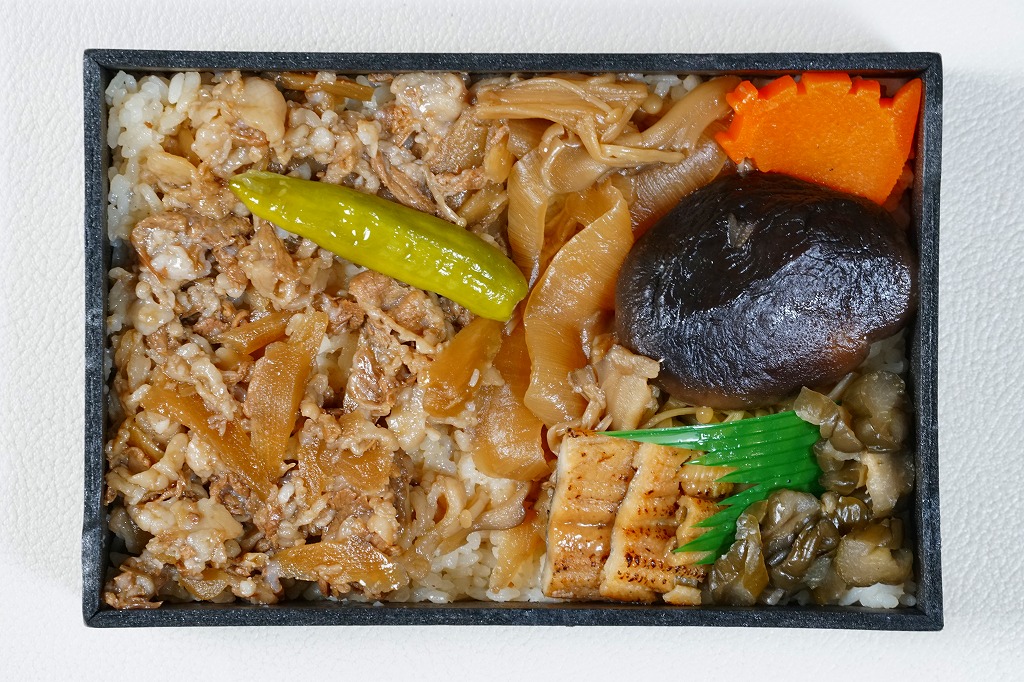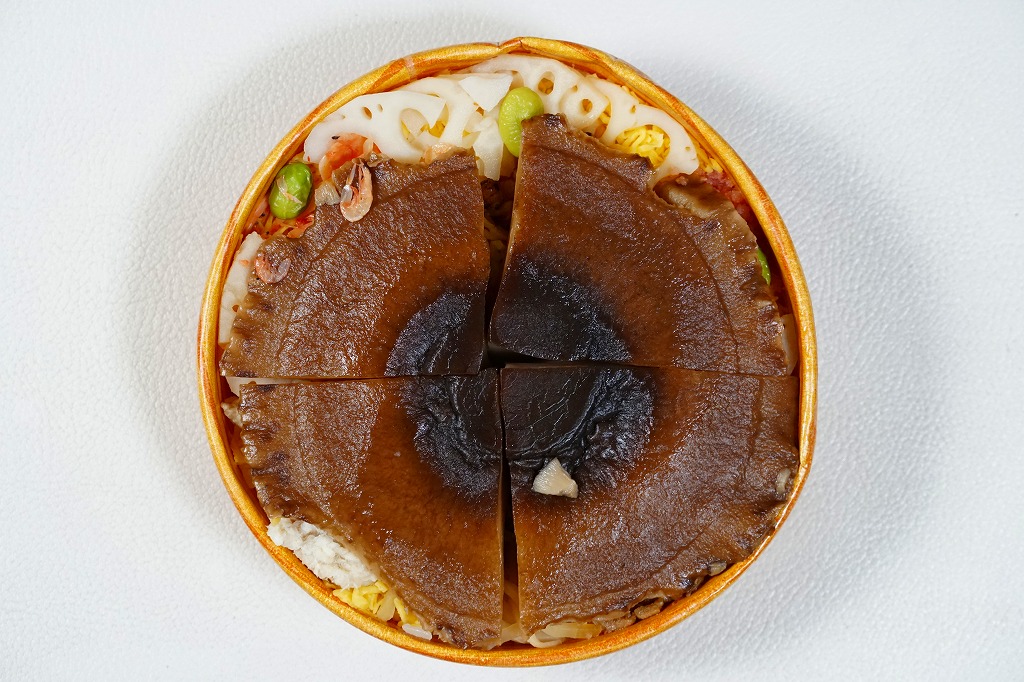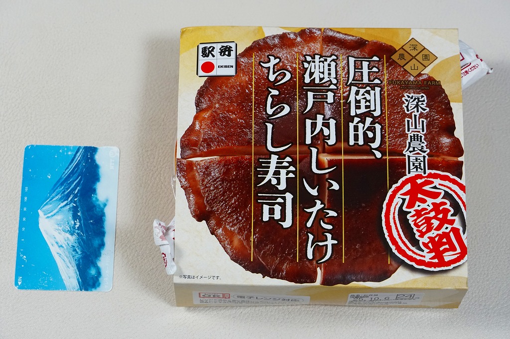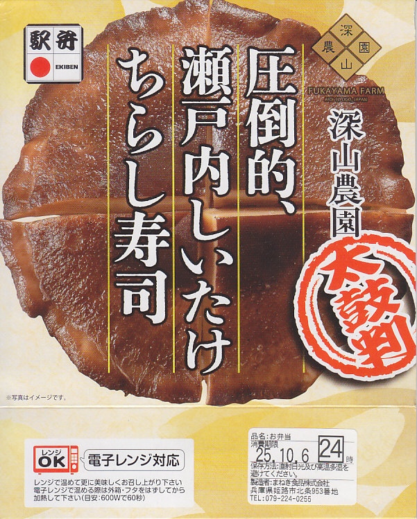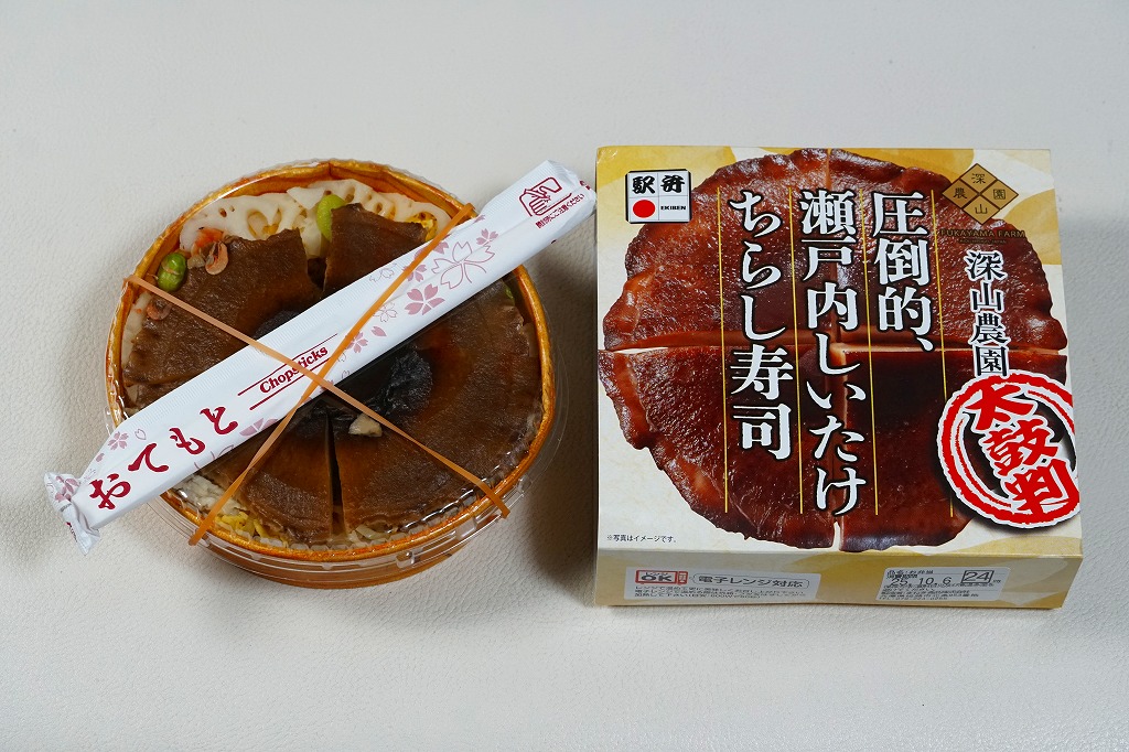 秋冬の駅弁大会シーズンに向けた、2025(令和7)年秋の新商品として、9月に全国で発売。10月からのJR東日本の駅弁キャンペーン「駅弁味の陣2025」にエントリー。真ん丸の紙容器に酢飯を詰め、錦糸卵、おぼろ、鶏そぼろ、焼穴子、鯛ほぐし身、甘酢蓮根、枝豆、海老などで覆い、これらすべてをたったひとつの椎茸煮で覆い尽くし、その写真に商品名を載せたスリーブに収める。「圧倒的、」の文字にふさわしい椎茸弁当。この深山農園の瀬戸内しいたけは、大きくても大味になったり固くなることなく、だし汁をたっぷり吸った肉厚しいたけのおいしさ。数少ない椎茸の駅弁で「素晴ら椎茸しいたけ弁当」以来約20年ぶりのヒット作になるか。