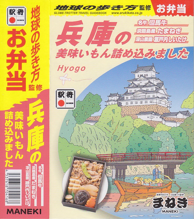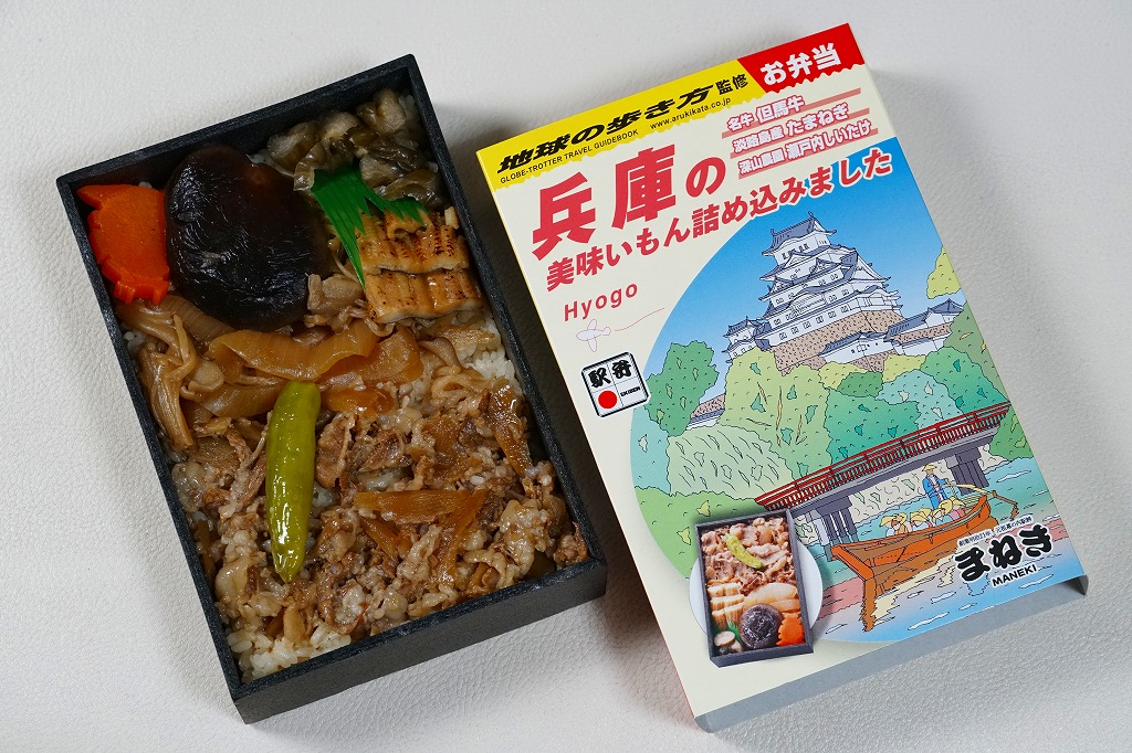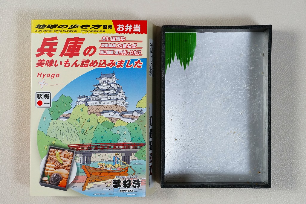 おおよそ弁当のものには見えないスリーブの絵柄は、該当のガイドブックと同じもので、名前を少し変えて中身の写真を加えた。長方形の容器にえきそばのだし飯を詰め、但馬牛のごぼう煮、淡路島産たまねぎ煮、深山農園瀬戸内しいたけ煮、焼穴子、姫路城型にんじん、しば漬などで覆う。味でいえば、だいたい牛丼であり、姫路駅弁の各種を詰め込んだ感じ。海外旅行ガイドブックの定番で、日本中すべての書店にあると思う本がなぜか駅弁売り場に置かれているように見えて、とても目立つと思った。