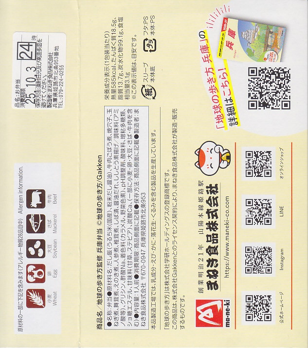 駅弁の名前は不明。現物で「地球の歩き方監修お弁当」とも「兵庫の美味いもん詰め込みました」とも読め、レシートでは「地球の歩き方兵庫」、プレスリリースでは「「地球の歩き方」監修のお弁当」とある。学研ホールディングスの旅行ガイドブック「地球の歩き方兵庫」の発売を記念し、調製元とのコラボレーションにより2025(令和7)年8月28日に姫路駅で、9月1日に東京駅で発売。