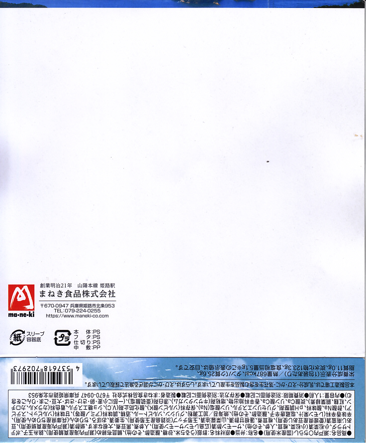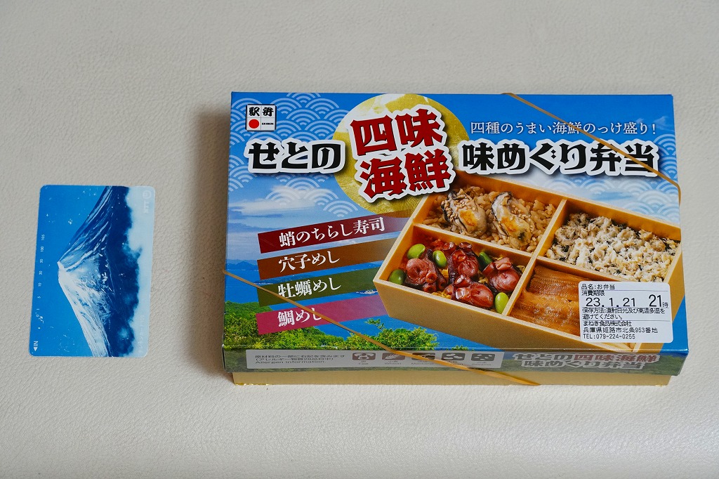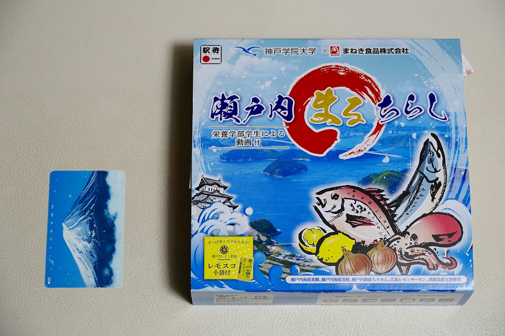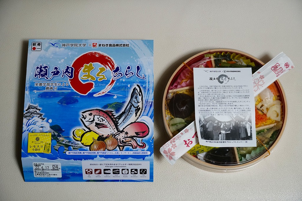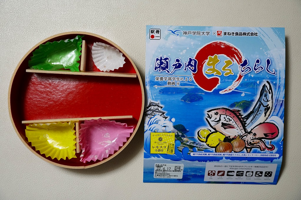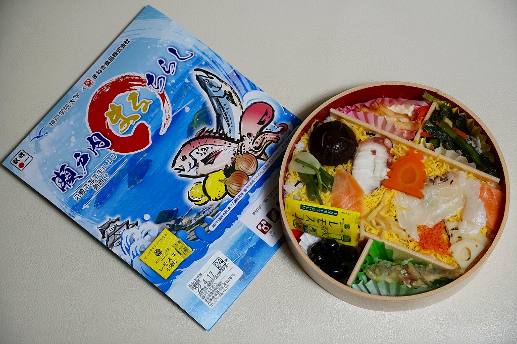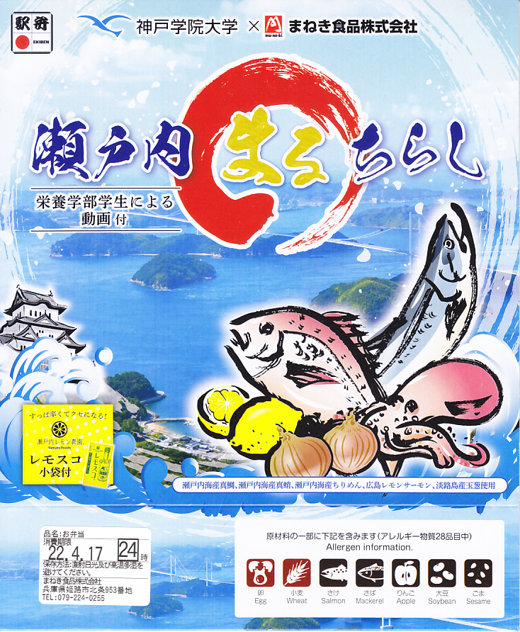 2022(令和4)年3月に発売か。神戸学院大学栄養学部の駅弁プロジェクトメンバーと調製元のコラボにより開発された駅弁。スリーブには瀬戸内海の写真に姫路城と、駅弁に使う食材のイラストを描く。丸い容器の中身は、酢飯を錦糸卵で覆い、タイ1切れ、タコ1切れ、サーモン、しいたけ、れんこん、山菜、生姜などを散らし、城型のニンジンで彩り、ポテトサラダとたまねぎチップ、小松菜漬、黒豆煮、大根なますと豆あじ南蛮漬、レモン汁の袋を添えるもの。これはタイとタコのちらし寿司、と理解できるかどうか。食事向けのような、おつまみ向けのような。4月までの販売か。