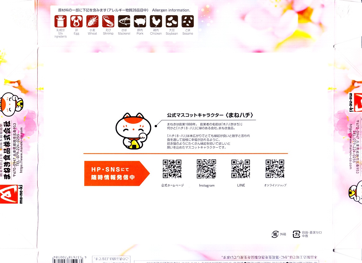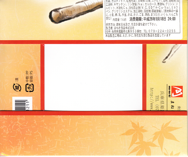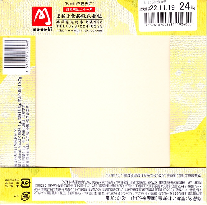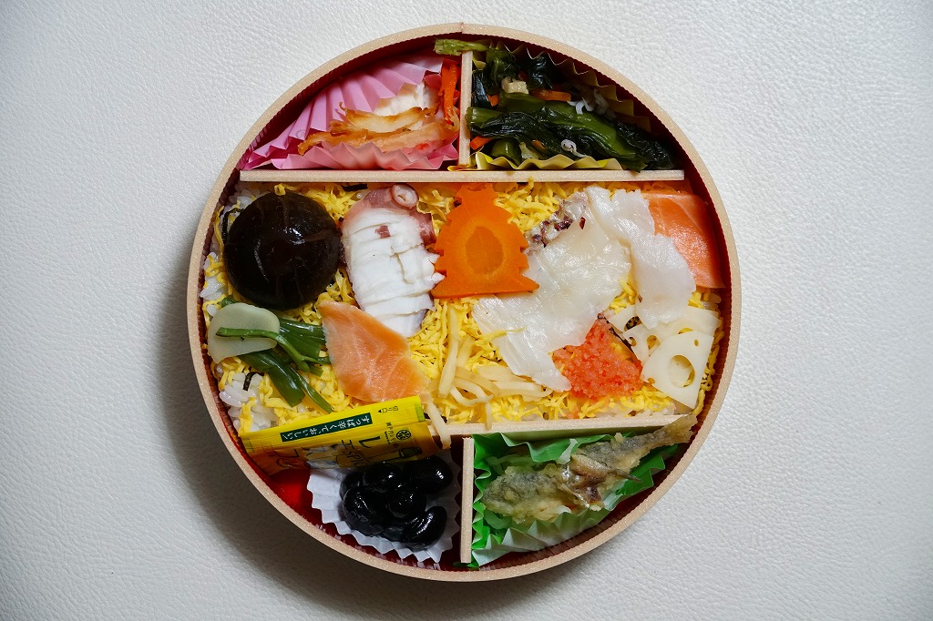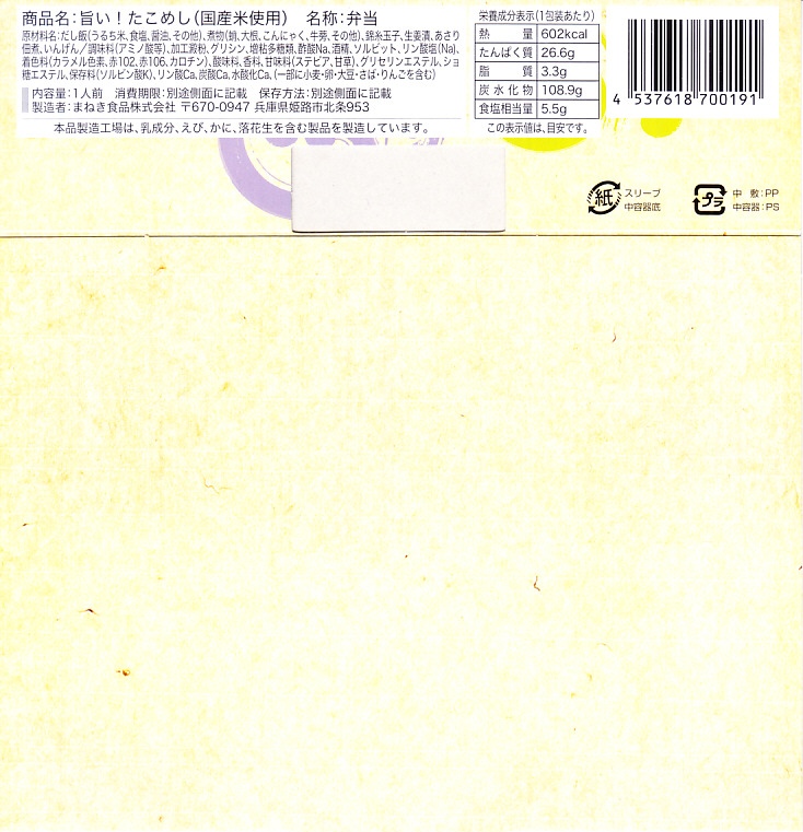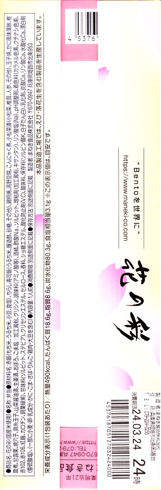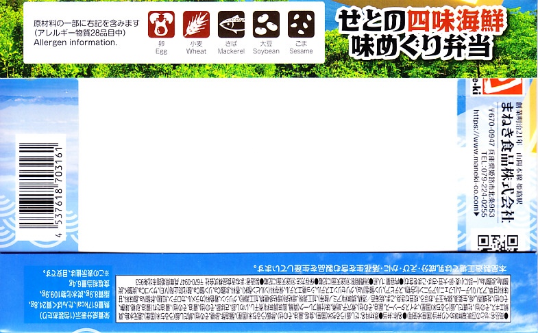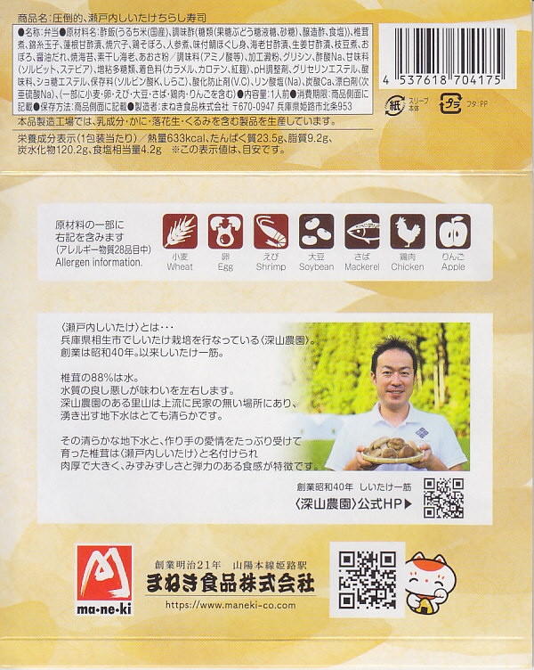 2022(令和4)年3月に発売か。神戸学院大学栄養学部の駅弁プロジェクトメンバーと調製元のコラボにより開発された駅弁。スリーブには瀬戸内海の写真に姫路城と、駅弁に使う食材のイラストを描く。丸い容器の中身は、酢飯を錦糸卵で覆い、タイ1切れ、タコ1切れ、サーモン、しいたけ、れんこん、山菜、生姜などを散らし、城型のニンジンで彩り、ポテトサラダとたまねぎチップ、小松菜漬、黒豆煮、大根なますと豆あじ南蛮漬、レモン汁の袋を添えるもの。これはタイとタコのちらし寿司、と理解できるかどうか。食事向けのような、おつまみ向けのような。4月までの販売か。