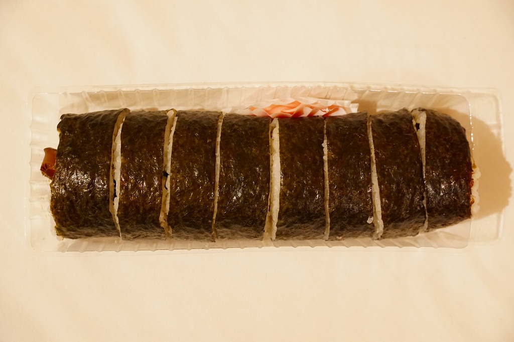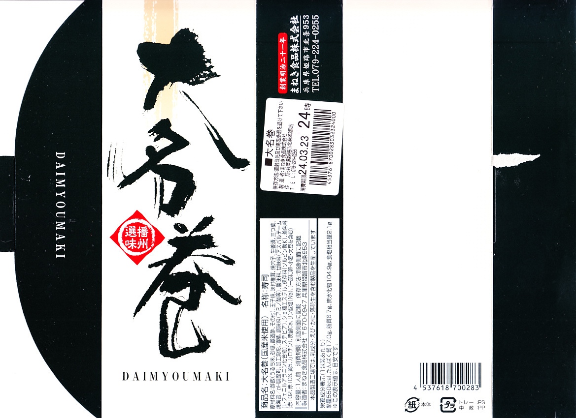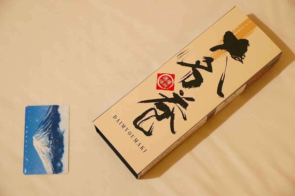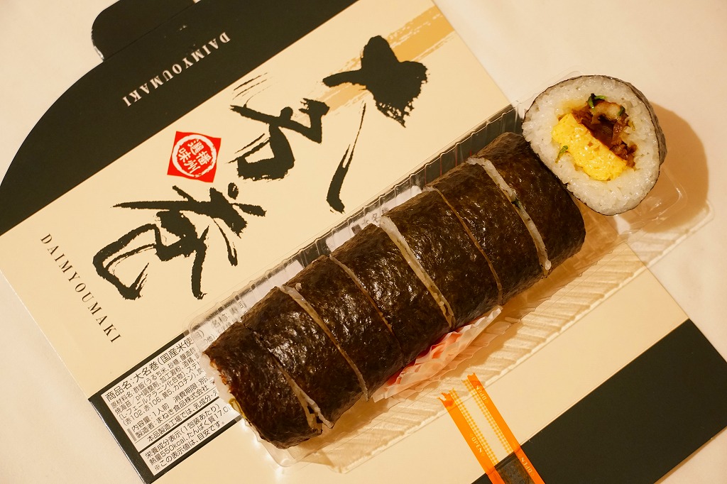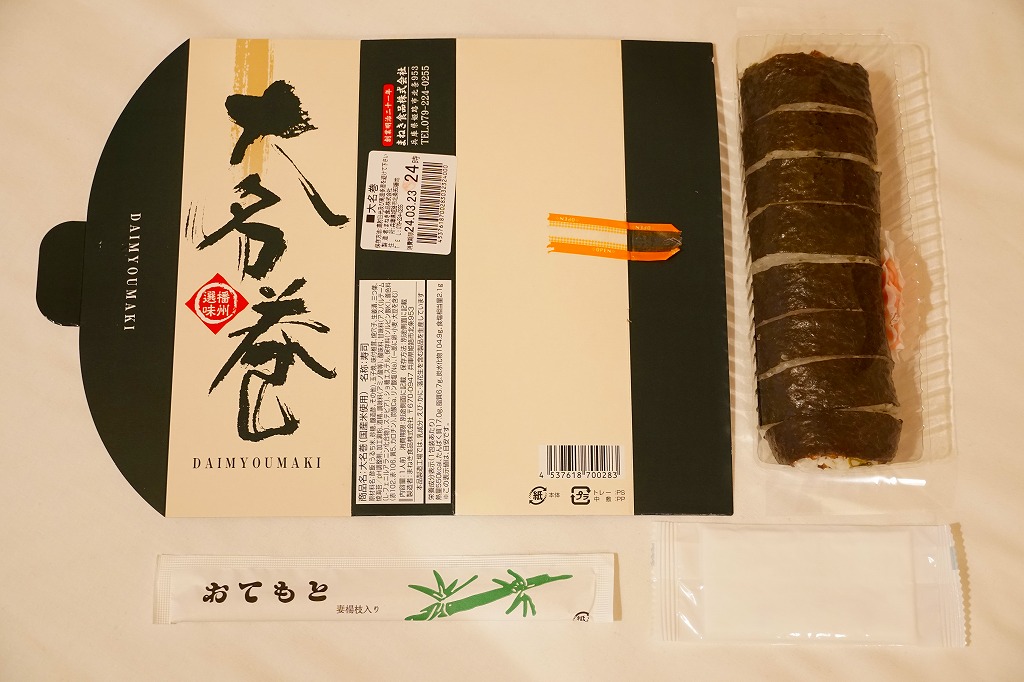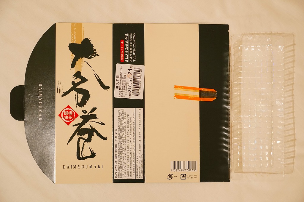 姫路駅で昭和時代から売られる駅弁ではないかと思う。大名巻やDAIMYOMAKIと書かれた専用の紙箱に、すると大名巻と呼ぶのだろう、玉子焼と焼穴子と椎茸と生姜とミツバを酢飯と焼海苔で巻いた太巻きが1本、8切れにカットされて収まる。弁当店の太巻きとして、しっかりできた印象。今は全国的に普及した節分の恵方巻と違い、価格も内容も落ち着いている。ただし、価格は2010年時点で580円、2014年4月の消費税率改定で600円、2017年時点で650円、2022年時点で800円、2023年時点で860円、2024年時点で960円と、他の駅弁より値上げ幅が大きい。