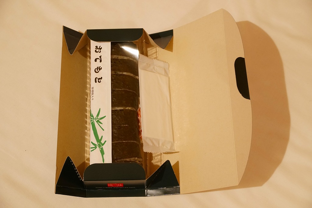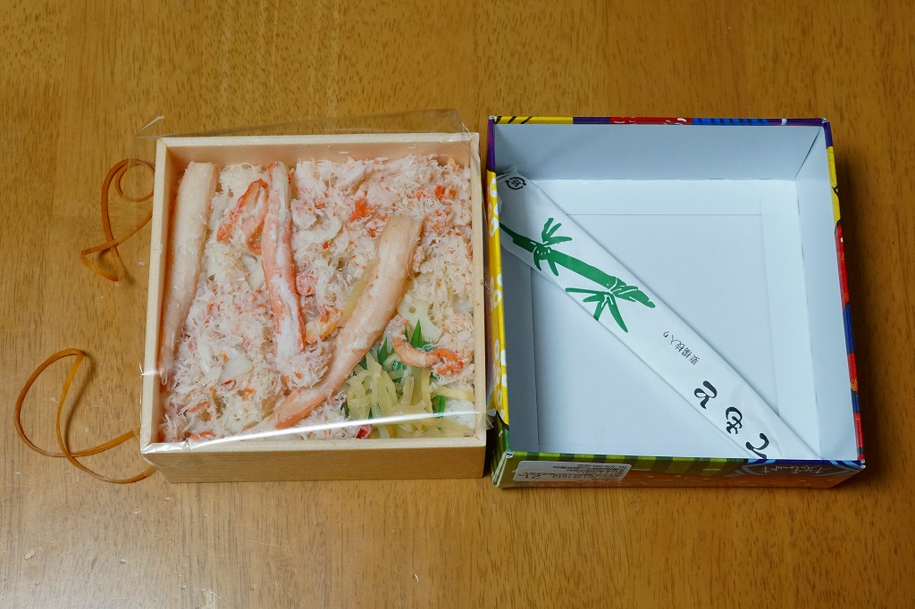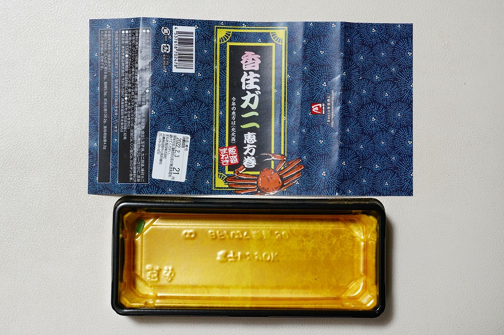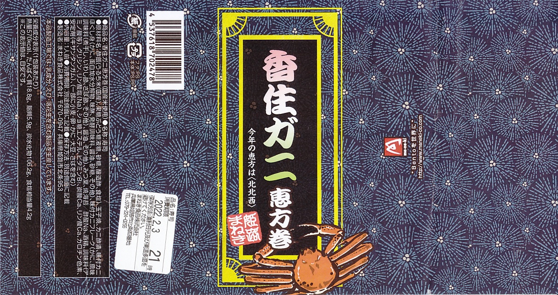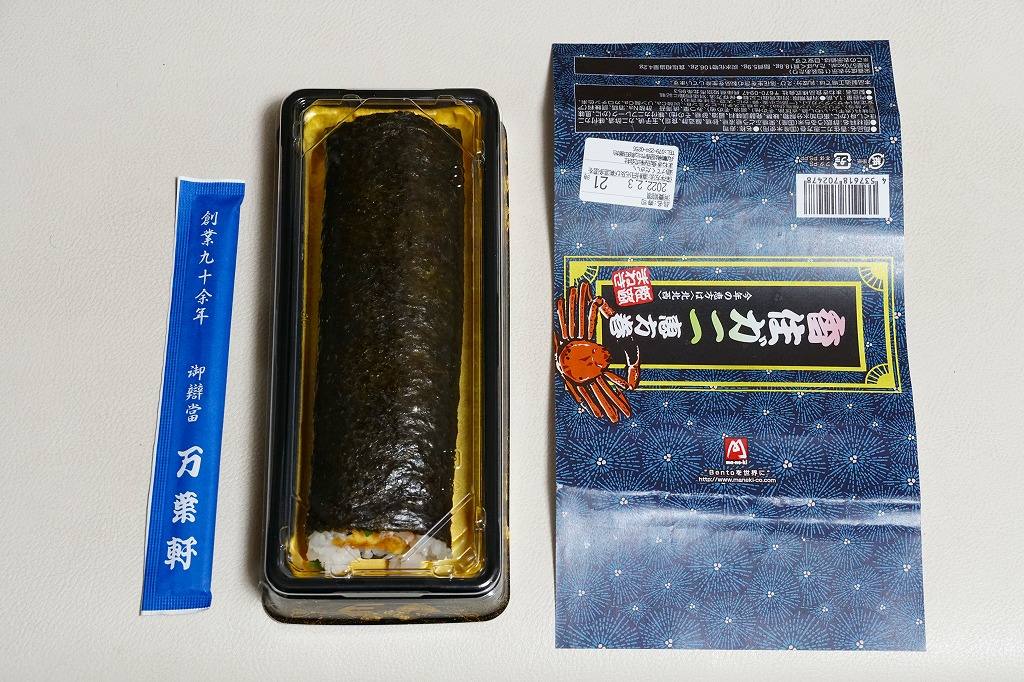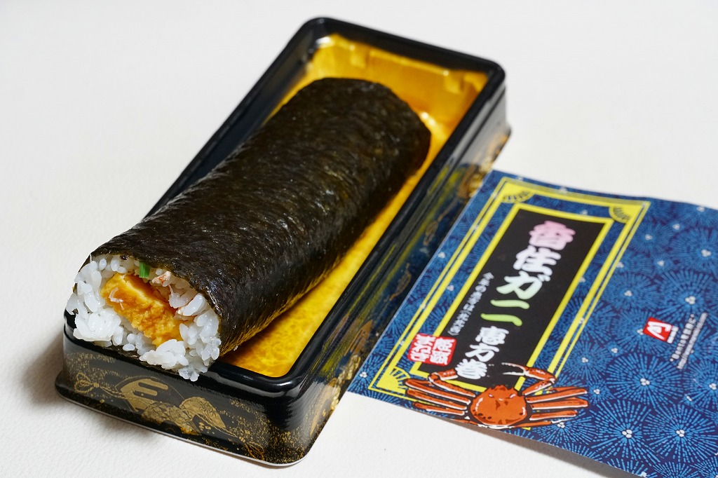 2022(令和4)年の節分の、2月3日に買えた姫路駅弁の恵方巻のひとつ。千葉駅へ輸送された商品を買うと、割りばしは千葉駅弁の万葉軒のものが付いてきた。酢飯と玉子焼とミツバと、カニの酢漬と味付ほぐし身とフレークを、海苔で巻いてプラ製の容器に置き、商品名を書いた掛紙で巻く。カニの風味や分量はあまりないかもしれない、行事どおり切り目のない、直接かぶりつけるサイズの太巻き。節分でなくても姫路駅ならば、優れた太巻き駅弁「大名巻」や棒寿司「名代あなご寿司」「名代松前寿司」が一年中買えると思う。