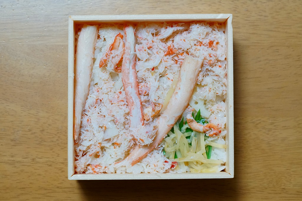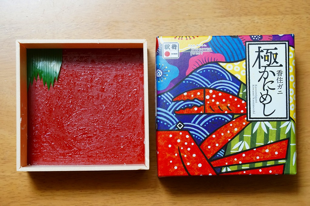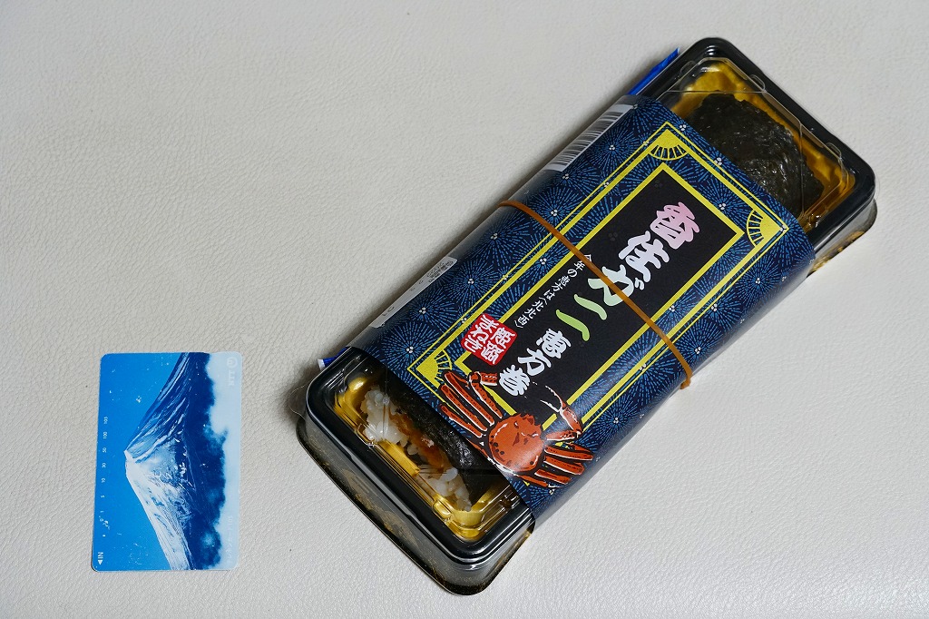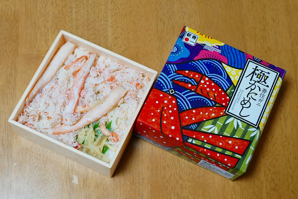 カニの姿が見えるふたの絵柄は和の風景。中身は酢飯をレンコン混じりのカニほぐし身で覆い、カニ脚を少し散らし、甘酢生姜を添える、シンプルで一般的な内容のカニ駅弁。見た目に白く、中身のすべてに酢が入り、なかなかの高価。2024年からは「日本海国産極かにめし」(1,680円)として輸送販売される。