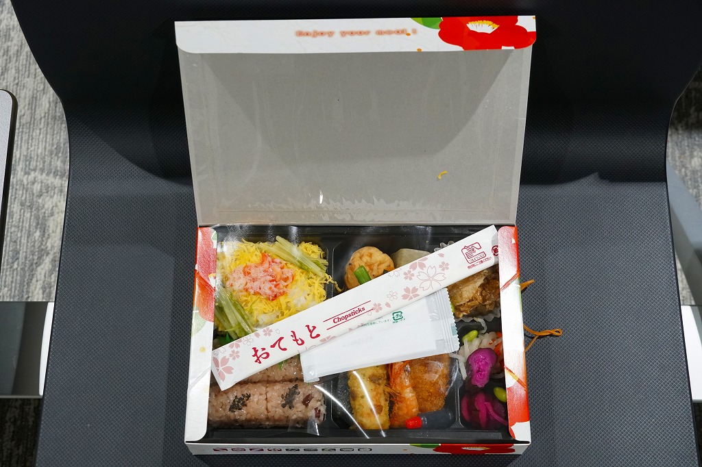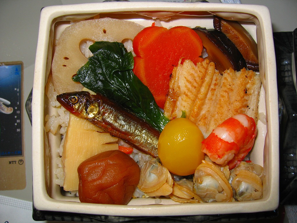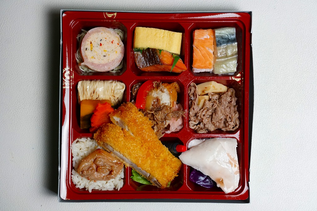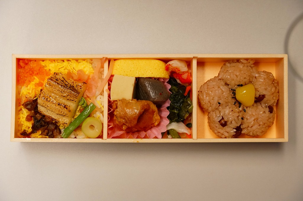 2010年代か、それ以前から存在していた商品か。もとは調製元の仕出し弁当店ブランド「味三昧」で取り扱われ、のちに駅弁売店で出てきたのではないかと思う。ふたに商品名を描いた細身の容器は、長方形3個分。その左右に栗を載せた花形の赤飯と、アナゴやシイタケなどのちらし寿司を据え、中央に鶏照焼、高野豆腐、こんにゃく煮、小松菜漬、玉子焼、かに風味蒲鉾などのおかずや付合せ。駅弁の発想では生まれないようにみえる、軽食以上の分量を持つ小箱。価格は2017年時点で600円、2023年時点で700円、2024年時点で780円、2025年時点で880円。