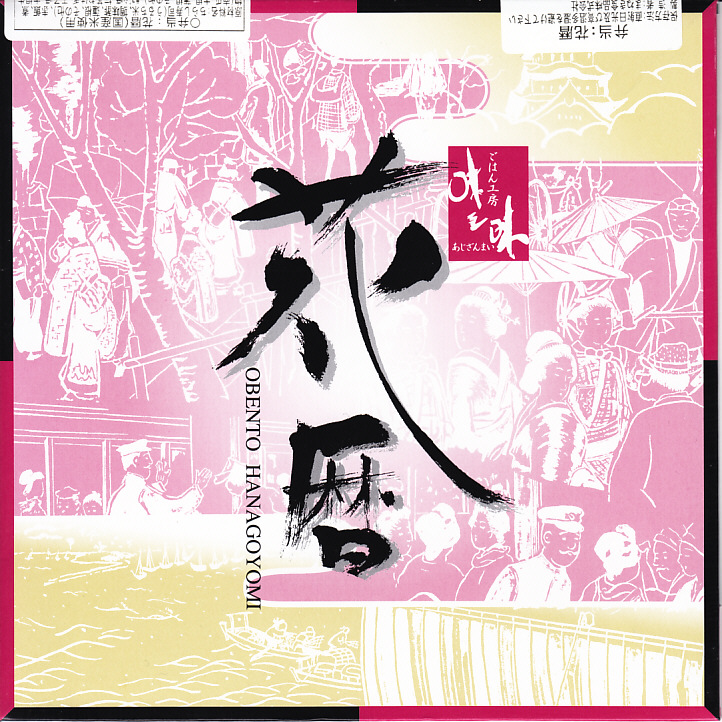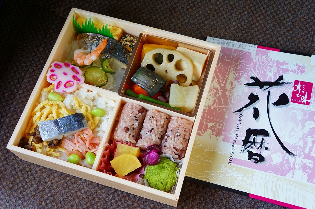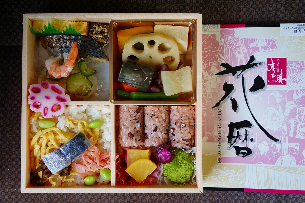 姫路駅ではどうも定番の駅弁らしい。松花堂の4区画に、ちらしずし、赤飯の俵飯に漬物とわらびもち、カボチャやレンコンなどの煮物、焼きサバと玉子焼と酢の物を詰める。京風の女性に人気のお弁当だそうな。価格は2014(平成26)年の購入時で1,000円、2015(平成27)年4月の消費税率改定により1,030円。2019年時点で1,000円。2020年時点で販売されていない模様。