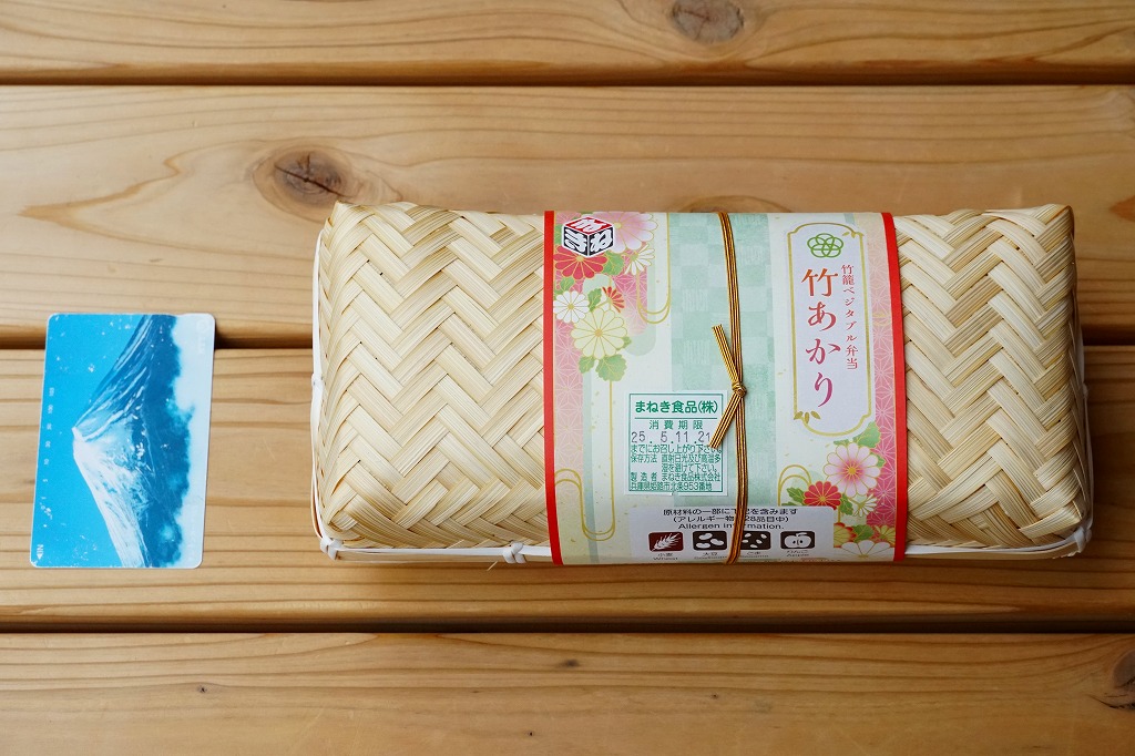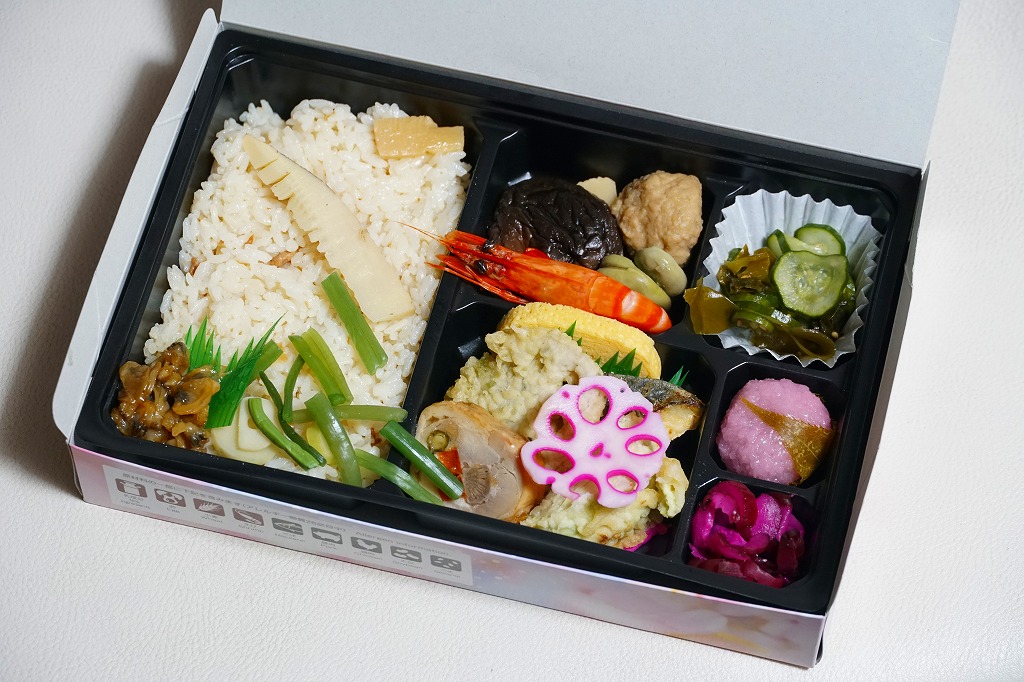 駅弁に使うには高級だと思う竹籠の商材に、商品名などを記して赤みがかった掛紙を巻く。野菜やきのこ類を中心に、肉・魚・卵・乳を使わずに仕上げたという中身は、甘酢生姜のいなりずし、山菜のいなりずし、栗としいたけのいなりずし、なすとかぼちゃとししとうの素揚げ、しいたけの天ぷら、甘酢大根、城型のにんじん、花木のような揚げ昆布、笹よもぎ餅などを折り重ねたもの。写真では華やかであり賑やかでも、実物を見たり食べれば落ち着きを感じた。