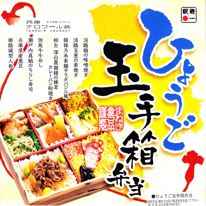 ふたには兵庫県土のシルエットと商品名、中身の写真とおしながき、観光キャンペーンのキャッチフレーズ「兵庫テロワール旅」の表記がある。中身は但馬牛牛めし、瀬戸内真蛸のちらし寿司、相生深山農園様の椎茸カレーパン粉焼き、揖保乃糸素麺サラダバジル風、淡路鶏の味噌焼き、淡路玉葱の素焼き、姫路城型人参など。これは今の兵庫県のうち主に瀬戸内海エリアで親しまれたり売り出し中の味覚を、かなり貪欲に詰めた玉手箱。