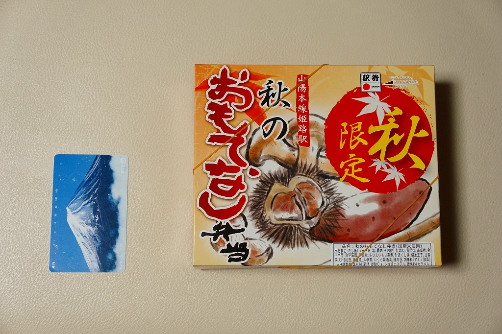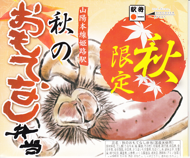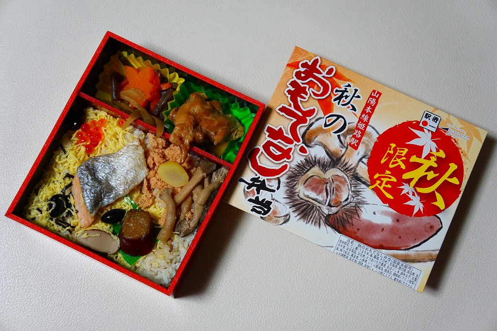 調製元と商品名から、姫路駅の秋駅弁と推測。しかし公式にも非公式にも、東京駅とスーパーの駅弁催事にしか情報がなく、姫路で売らない疑義駅弁の可能性がある。白御飯を錦糸卵で覆い、焼き鮭、鮭フレーク、クリ、シメジ、イクラ、サツマイモ、マツタケなどを散らし、鶏照焼ときんぴらを添え、クリとイモとキノコを描いたふたをかける。悪いところはないが、構造も見た目も味も内容も、まるで日本レストランエンタプライズ(NRE)の東京駅弁。ここに姫路も関西も西日本も何もなく、東京駅で売っても姫路やその駅弁を思い起こすことはないだろう。「おかめ弁当」でも持ってこればいいのにと思う。2016年秋のみの販売か。2017年からは「秋の姫路城弁当」が売られる。