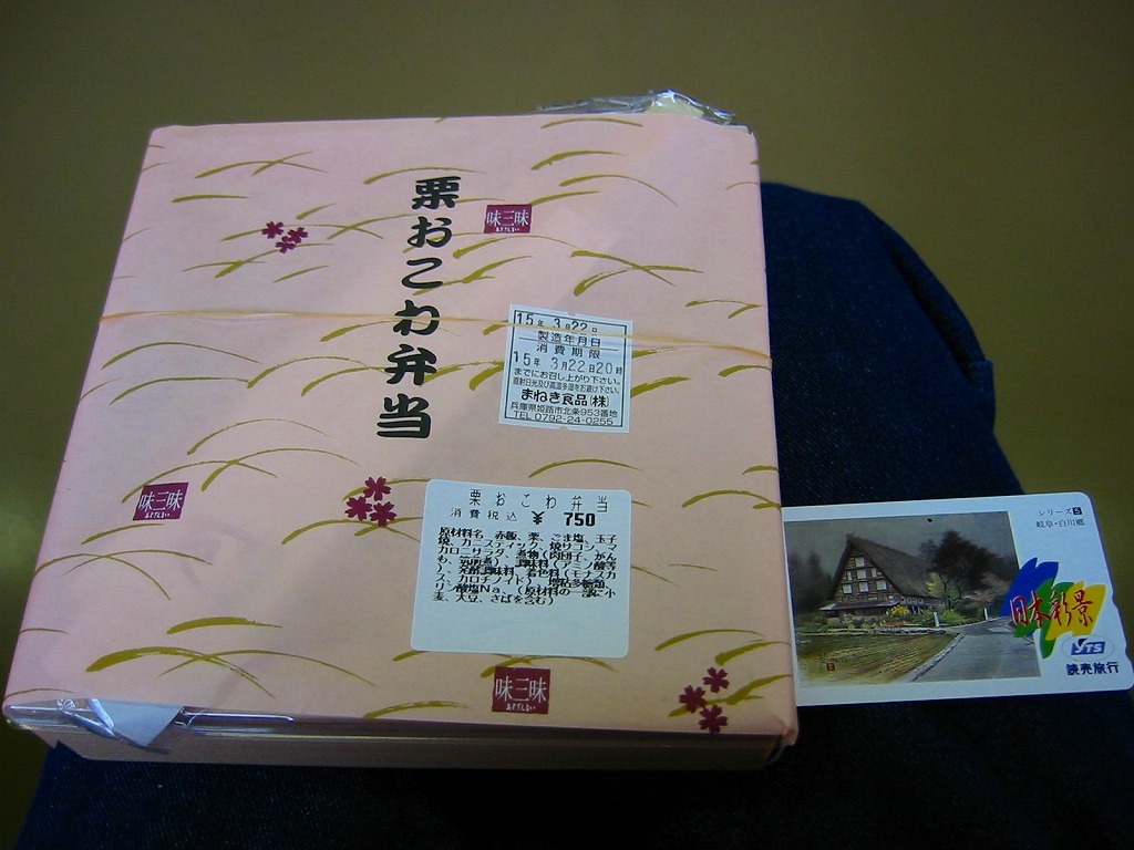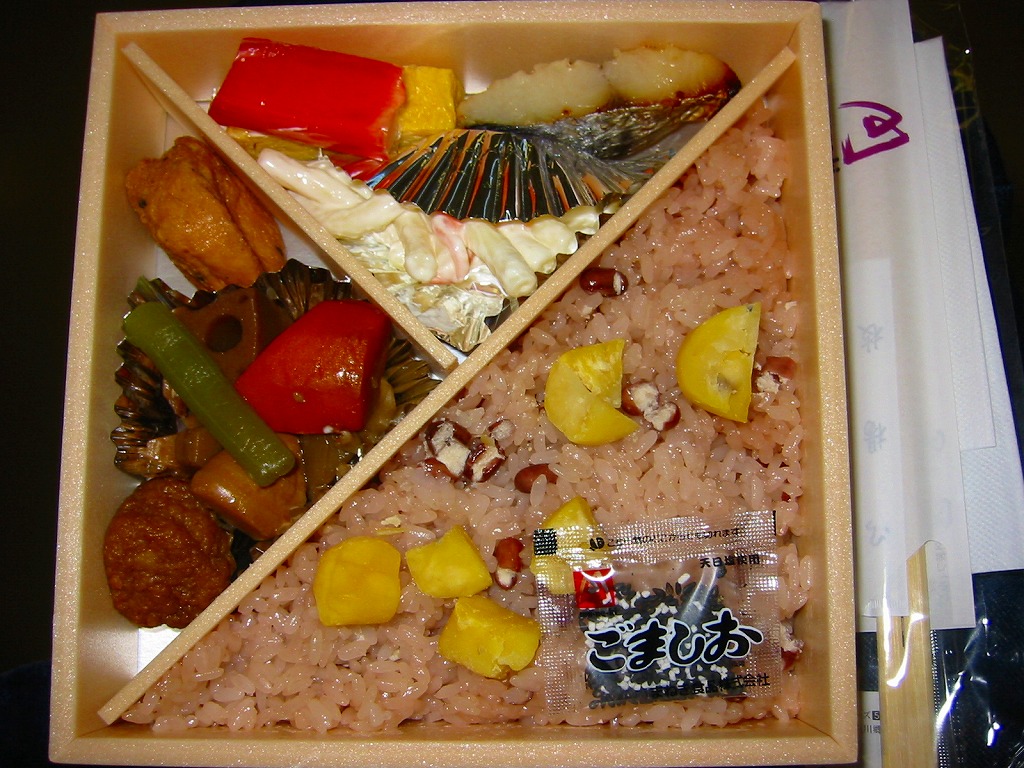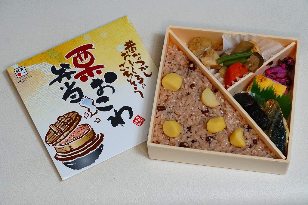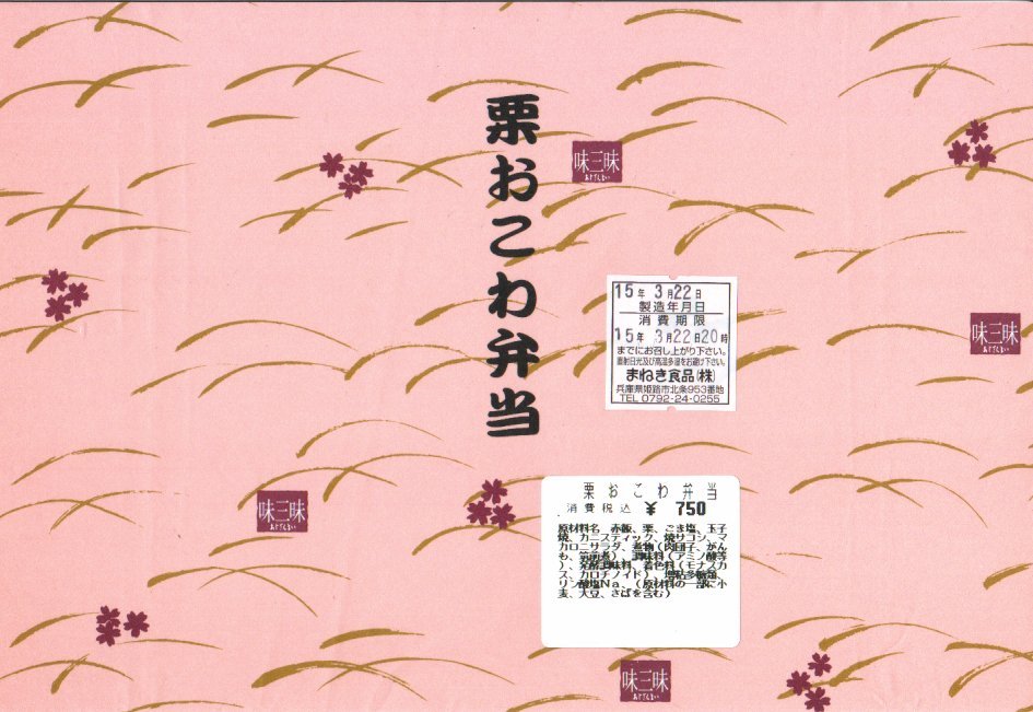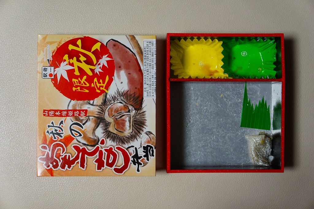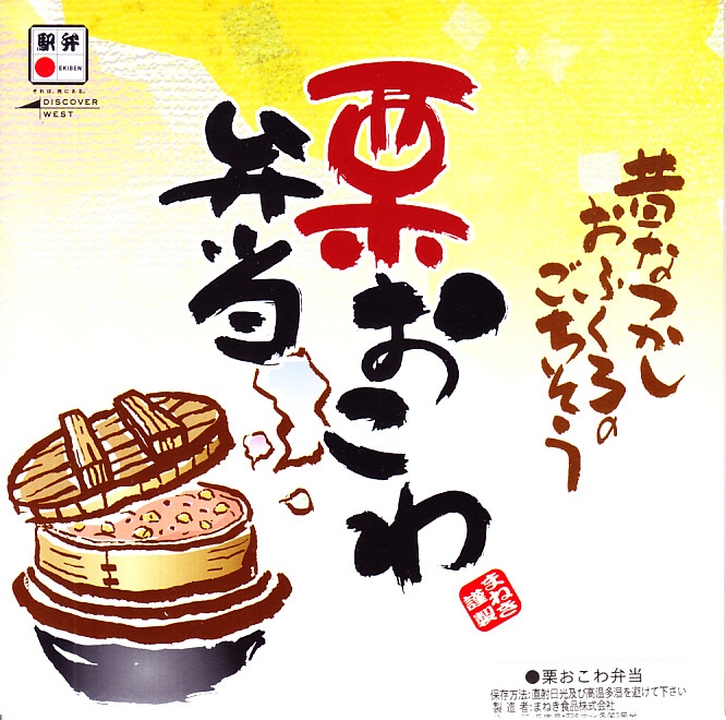 1990年代までには発売か。姫路駅弁のロングセラー。正方形の容器を対角線に区切り、半分で赤飯に小さな栗をチラシ、残りの半分で筑前煮と肉団子、残りに焼サバ、玉子焼、花豆、かまぼこ、しば漬。「栗おこわ」なのに赤飯を使うのは岡山駅の駅弁と同じで、ここでも郷土料理なのだろうか。価格は2003年時点で750円、2014年時点で810円、2016年時点で850円、2019年時点で880円、2022年時点で920円、2024年時点で1,060円。