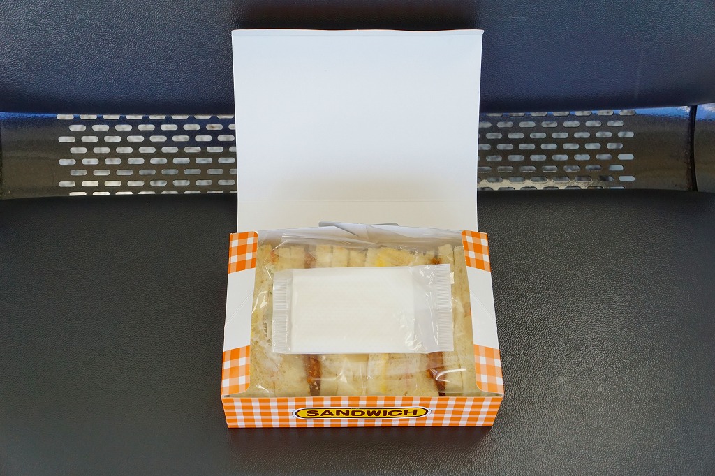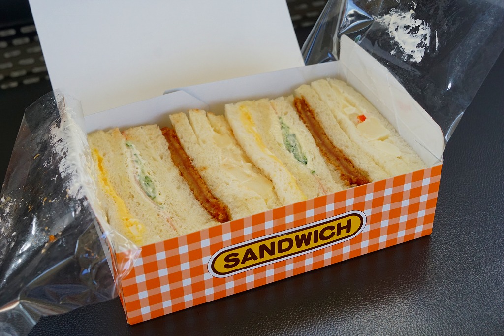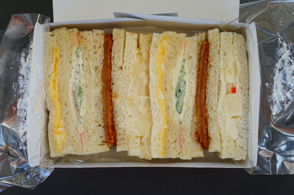 朝の姫路駅の駅弁売店で買えた、箱入りサンドイッチ。コンビニやエキナカでない駅弁売店でサンドイッチが売られることは少なくなったため、これは珍しいぞと思い買ってみたら、関東と関西でありふれた神戸屋の商品であった。中身はタマゴ、ハムときゅうり、ハムカツ、ポテトが各2切れで、箱入りサンドイッチとしてはかなりの具だくさん。