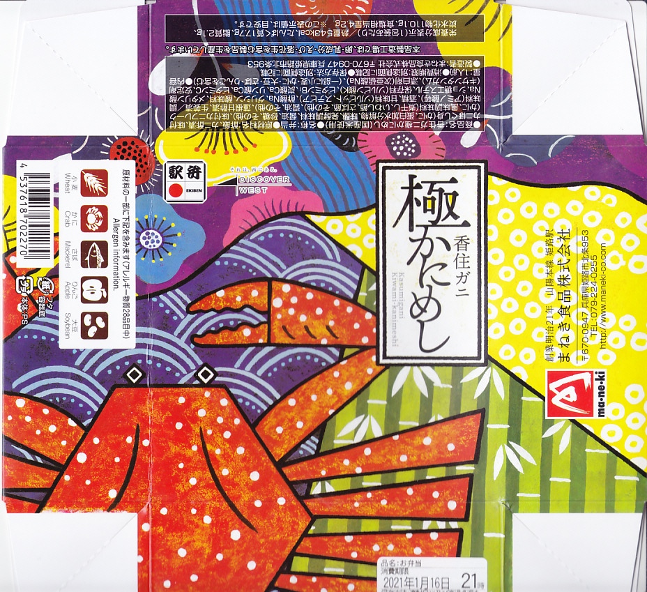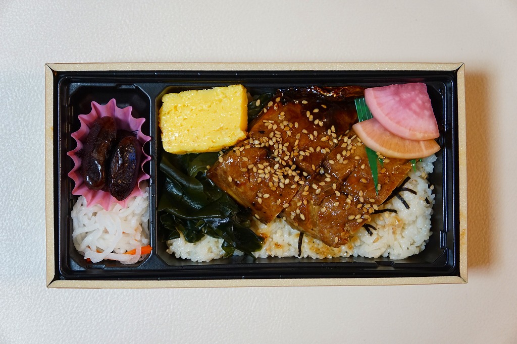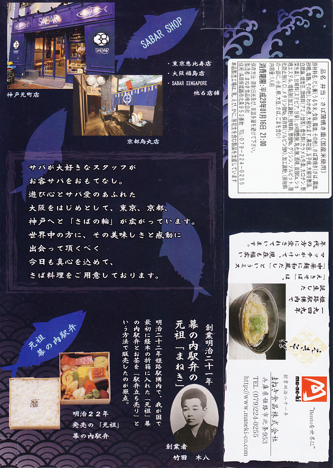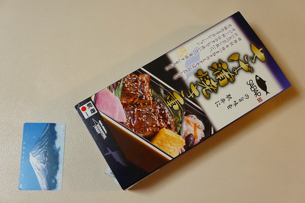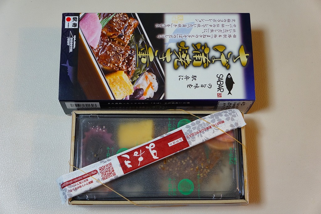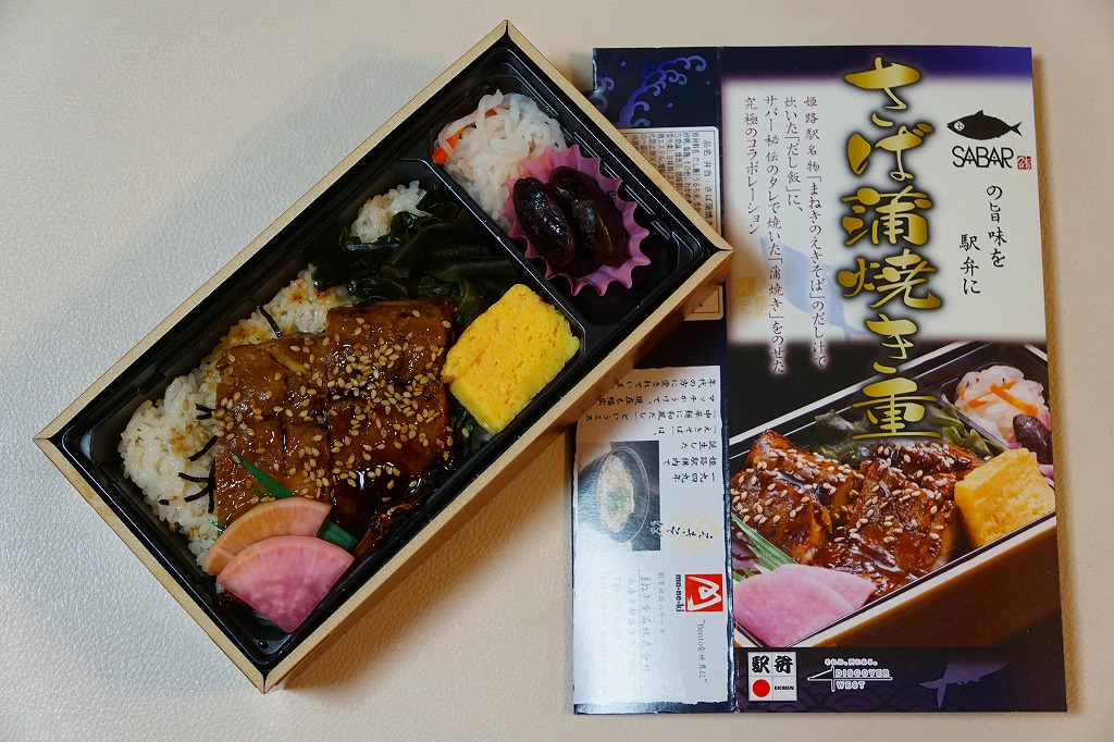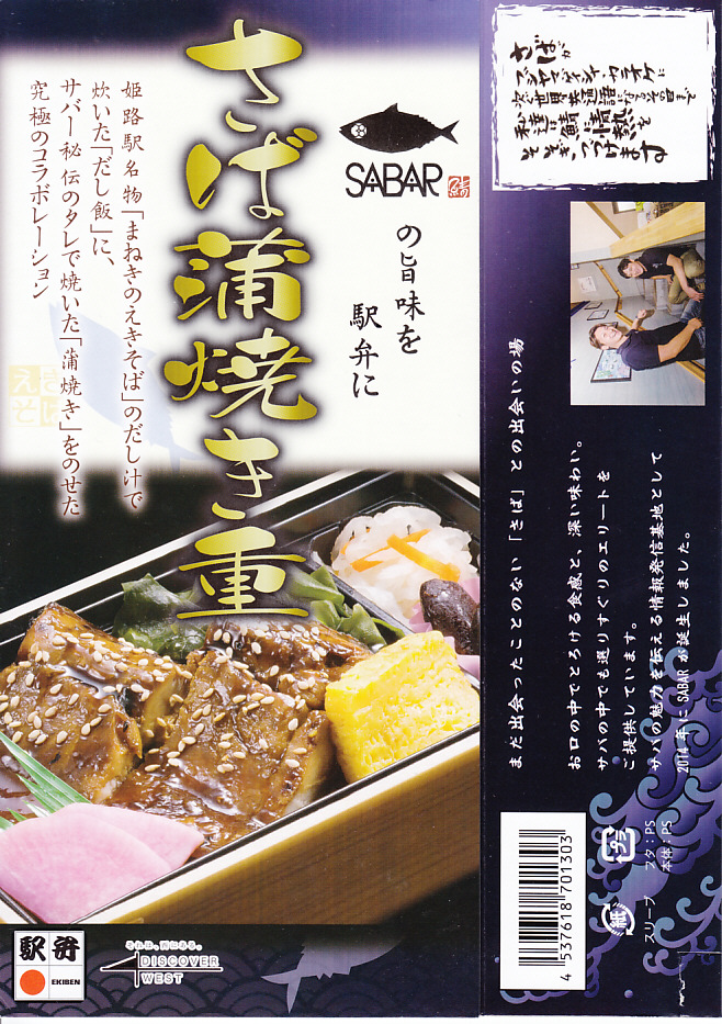 2017(平成29)年1月の発売か。パッケージの記載事項から、姫路駅の駅弁屋と、大阪府豊中のサバ業者が共同開発した駅弁だと想像する。姫路駅の名物「えきそば」のだし汁で炊いた御飯に、秘伝のタレで焼いたというサバの蒲焼きを置き、刻み海苔、わかめ、玉子焼、甘酢大根で囲い、大根なますと煮豆を添える。