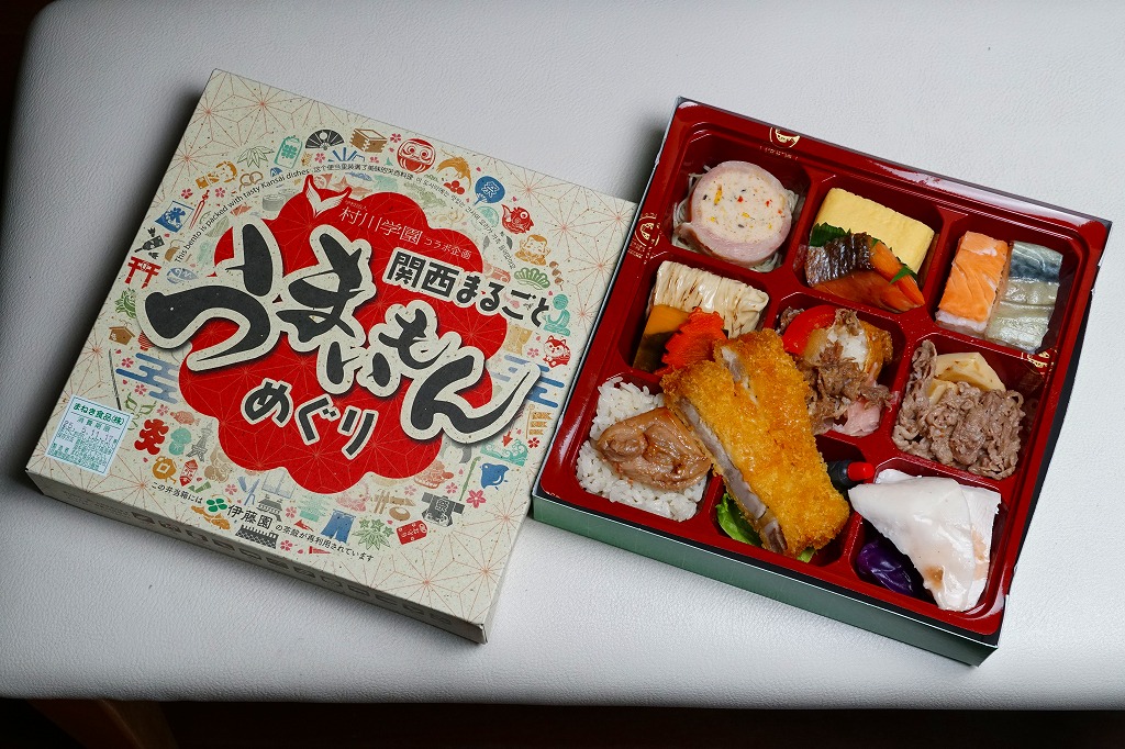 麻の葉文様に日本らしいアイコンが賑やかな専用の紙箱には、伊藤園の茶殻が再利用されていると書いてある。近畿2府4県の食材や食文化を取り入れた献立を詰め合わせたという中身は、大阪として押寿司と大阪豚ロースとんかつ、京都として煮物、兵庫としてだし飯と淡路どりのタレ焼きとだし巻き玉子、滋賀として銀鮭の幽庵焼き、奈良として煮物あんと三輪素麺のジェノベーゼ風、和歌山として蒸し鶏の梅タレがけ、そして大阪×兵庫として化粧いなり、村上学園として神戸牛のオイスターソース炒めと若鶏のガランティーヌと筍の土佐煮。これらを9区画に詰め合わせた、高額なお弁当。
