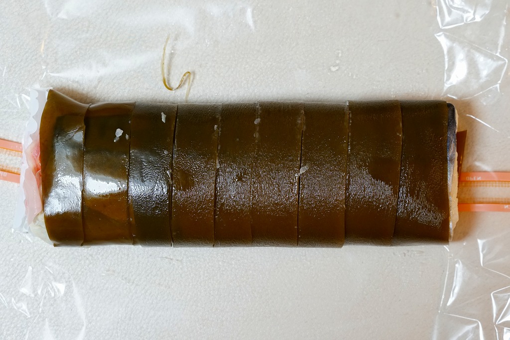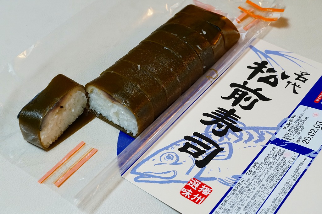 だいぶ古くからあるのではないかと思う駅弁。酢飯にシメサバを合わせて黒板昆布で巻く棒寿司が1本、9切れにカットされてフィルムに包まれ、紙箱に収まる。松前寿司とは、昆布巻の棒寿司、あるいは北海道産の昆布で巻いた鯖寿司に対する総称で、現在の北海道松前地方から大阪へ船で運ばれた昆布を使ったことにちなむ。サバ寿司の昆布巻きは他の駅の駅弁にもあるが、これを松前寿司と名乗り売る駅弁屋は、ここだけではないかと思う。密封される土産物と違い、列車内でも食べやすい。価格は2010年時点で1,300円、2014年時点で1,350円、2024年時点で1,500円、2025年時点で1,580円。